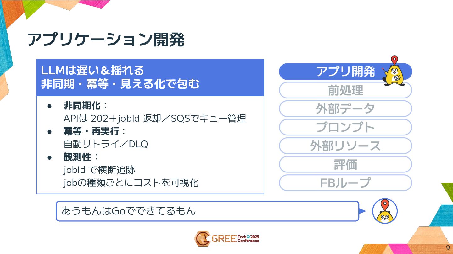 観測性: jobId で横断追跡 jobの種類ごとにコストを可視化 9 あうもんはGoでできてるもん LLMは遅い&揺れる 非同期・冪等・見える化で包む