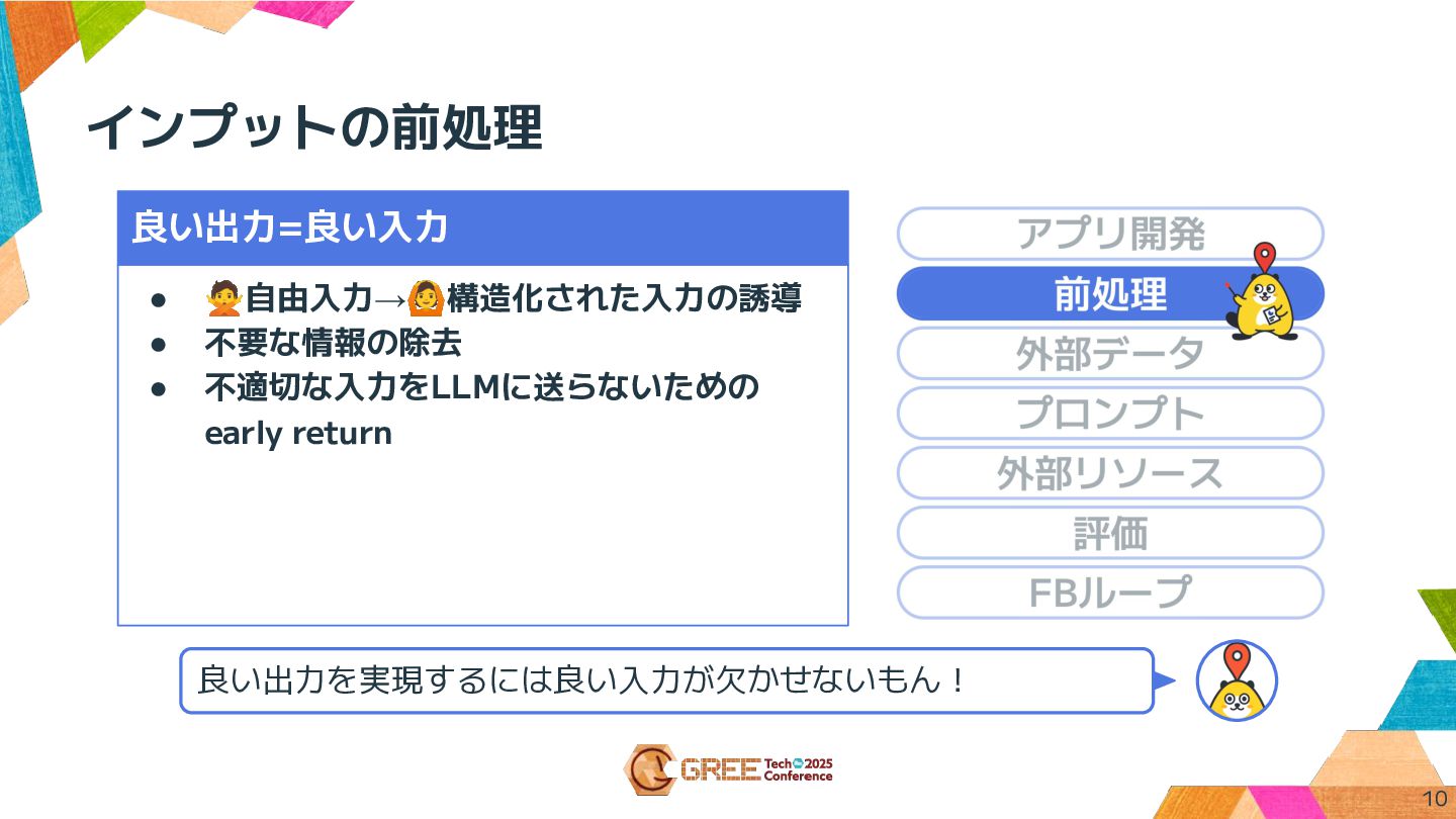 • 🙅自由入力→🙆構造化された入力の誘導 • 不要な情報の除去 • 不適切な入力をLLMに送らないための early return 良い出力=良い入力 インプットの前処理