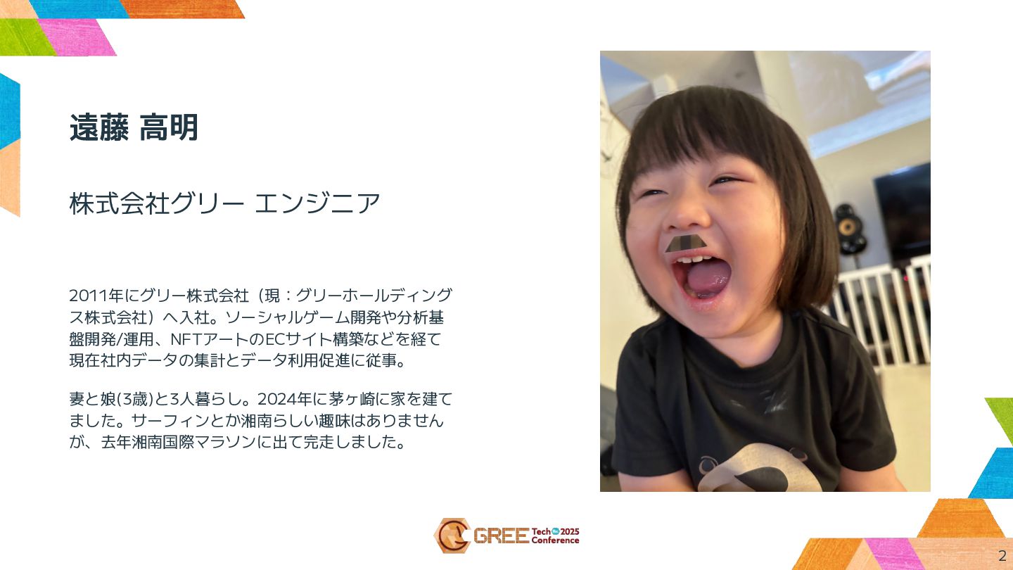 遠藤 高明 2011年にグリー株式会社(現:グリーホールディング ス株式会社)へ入社。ソーシャルゲーム開発や分析基 盤開発/運用、NFTアートのECサイト構築などを経て 現在社内データの集計とデータ利用促進に従事。 妻と娘(3歳)と3人暮らし。2024年に茅ヶ崎に家を建て ました。サーフィンとか湘南らしい趣味はありません が、去年湘南国際マラソンに出て完走しました。 株式会社グリー