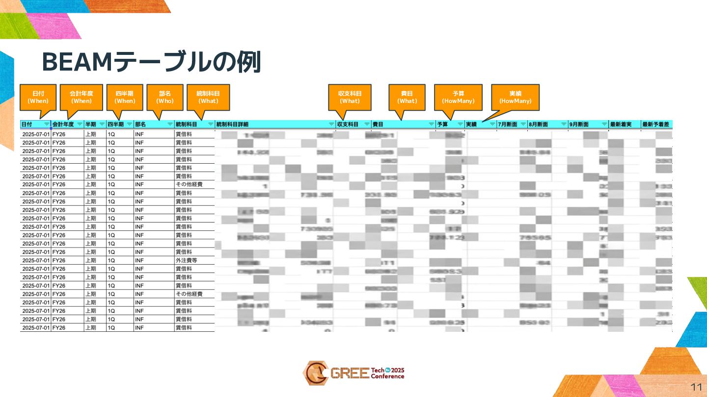 BEAMテーブルの例 11 日付 (When) 会計年度 (When) 四半期 (When) 部名 (Who)