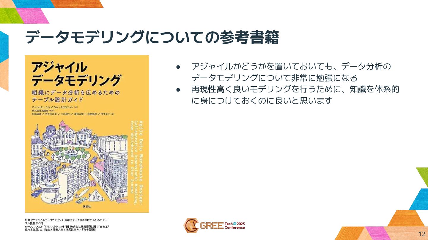データモデリングについての参考書籍 • アジャイルかどうかを置いておいても、データ分析の データモデリングについて非常に勉強になる • 再現性高く良いモデリングを行うために、知識を体系的 に身につけておくのに良いと思います 12 出典:『アジャイルデータモデリング 組織にデータ分析を広めるためのテー