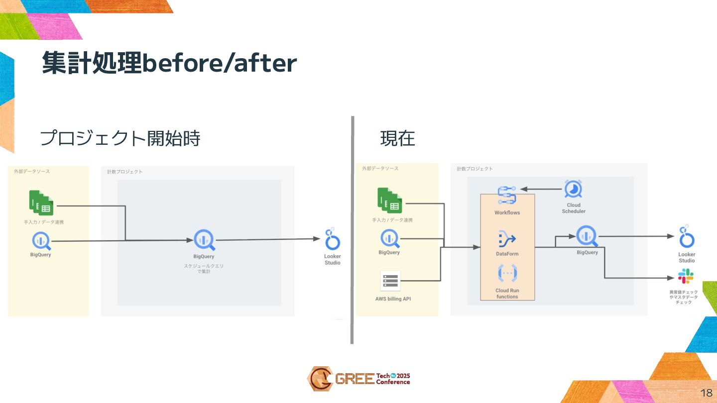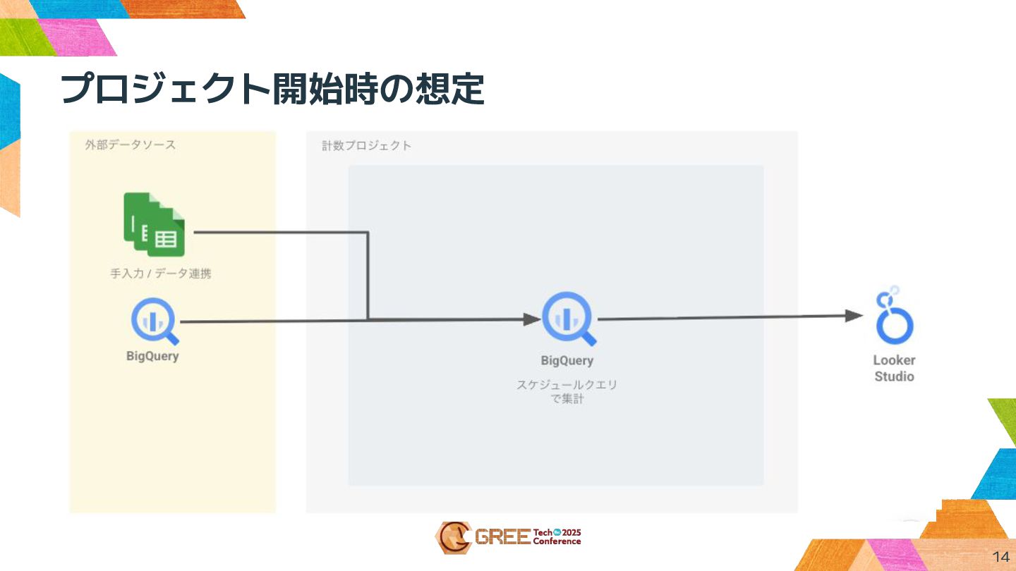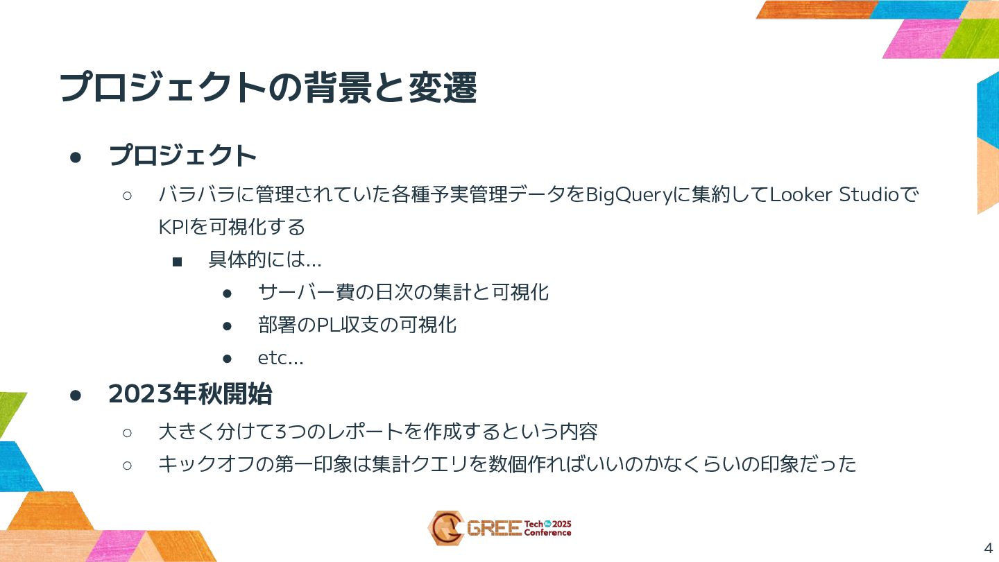 プロジェクトの背景と変遷 • プロジェクト ◦ バラバラに管理されていた各種予実管理データをBigQueryに集約してLooker Studioで KPIを可視化する ▪ 具体的には… •