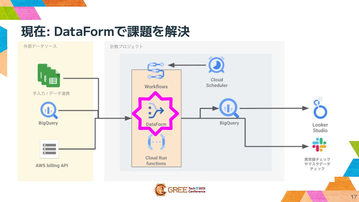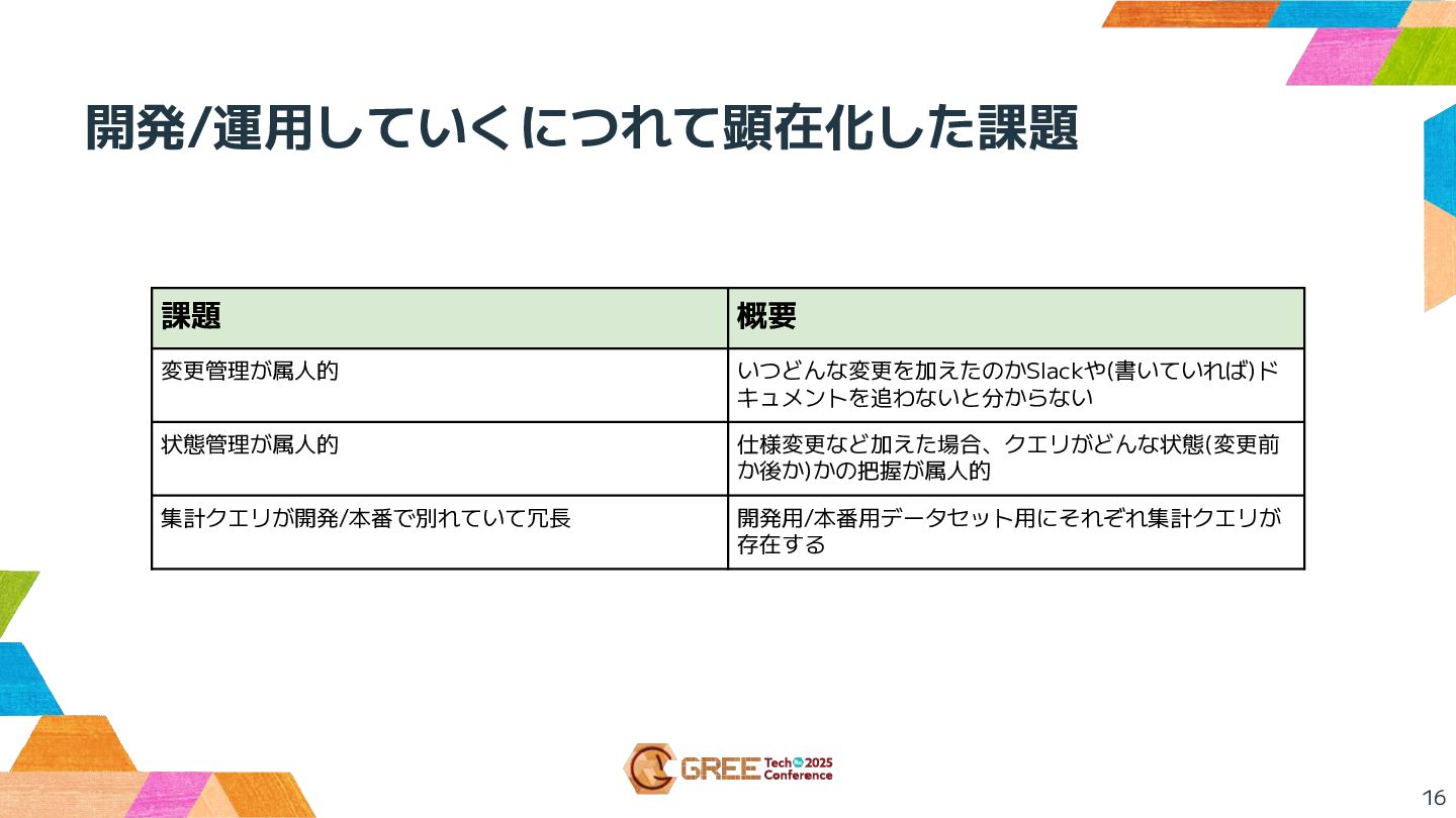 開発/運用していくにつれて顕在化した課題 16 課題 概要 変更管理が属人的 いつどんな変更を加えたのかSlackや(書いていれば)ド キュメントを追わないと分からない 状態管理が属人的 仕様変更など加えた場合、クエリがどんな状態(変更前 か後か)かの把握が属人的