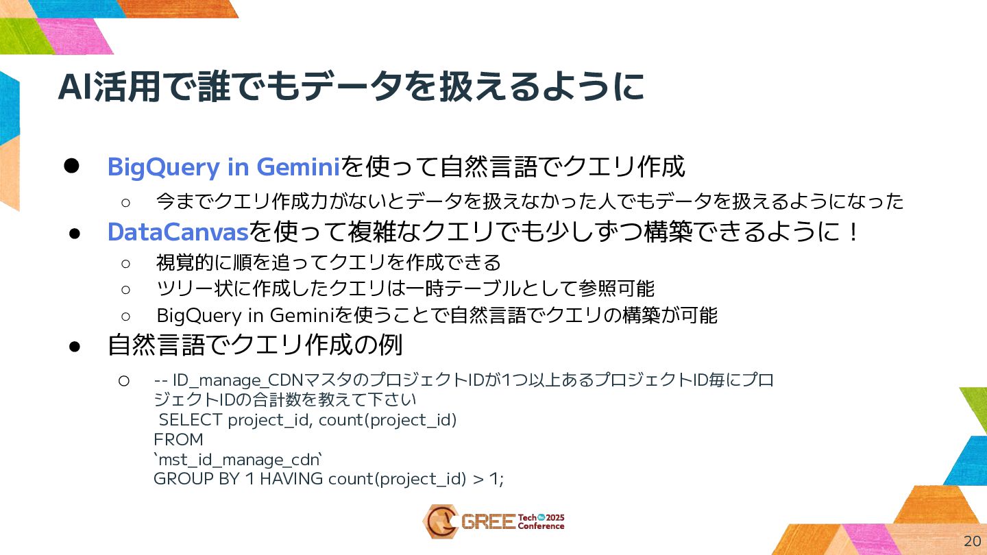 視覚的に順を追ってクエリを作成できる ◦ ツリー状に作成したクエリは一時テーブルとして参照可能 ◦ BigQuery in Geminiを使うことで自然言語でクエリの構築が可能 • 自然言語でクエリ作成の例 ◦ 20 -- ID_manage_CDNマスタのプロジェクトIDが1つ以上あるプロジェクトID毎にプロ ジェクトIDの合計数を教えて下さい SELECT project_id, count(project_id) FROM `mst_id_manage_cdn` GROUP BY 1 HAVING count(project_id) > 1;