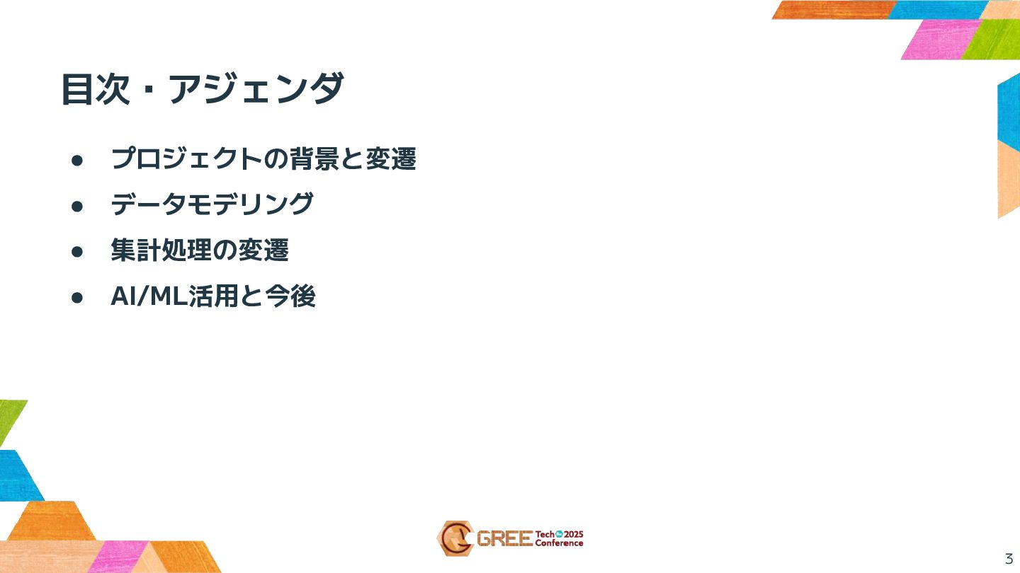 目次・アジェンダ • プロジェクトの背景と変遷 • データモデリング • 集計処理の変遷 • AI/ML活用と今後 3
