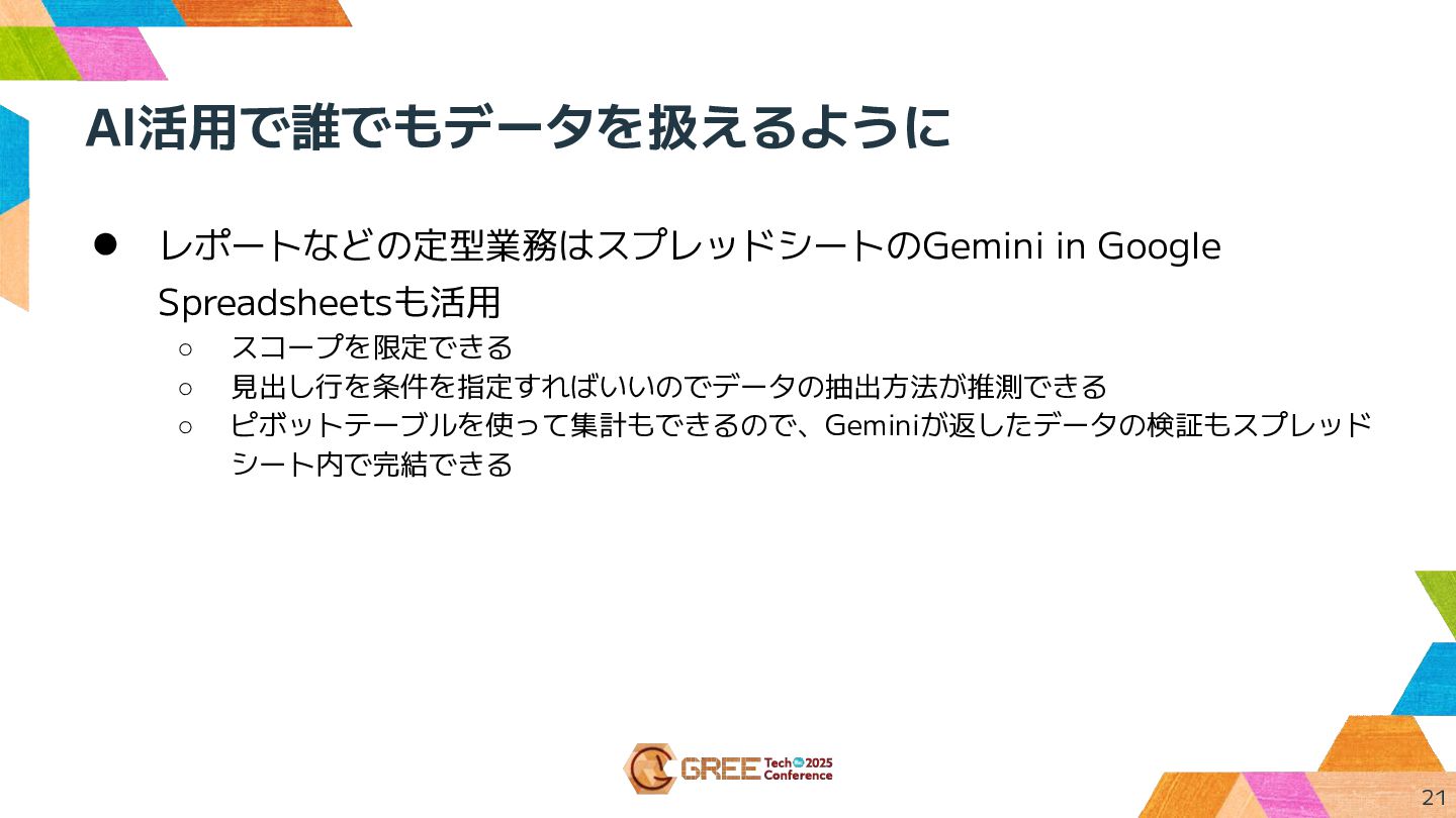 AI活用で誰でもデータを扱えるように • レポートなどの定型業務はスプレッドシートのGemini in Google Spreadsheetsも活用 ◦ スコープを限定できる ◦ 見出し行を条件を指定すればいいのでデータの抽出方法が推測できる