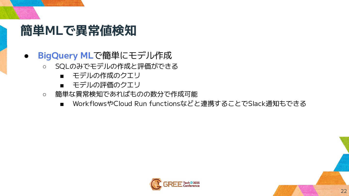 簡単MLで異常値検知 • BigQuery MLで簡単にモデル作成 ◦ SQLのみでモデルの作成と評価ができる ▪ モデルの作成のクエリ ▪ モデルの評価のクエリ