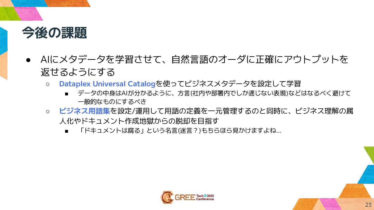 今後の課題 • AIにメタデータを学習させて、自然言語のオーダに正確にアウトプットを 返せるようにする ◦ Dataplex Universal Catalogを使ってビジネスメタデータを設定して学習 ▪ データの中身はAIが分かるように、方言(社内や部署内でしか通じない表現)などはなるべく避けて