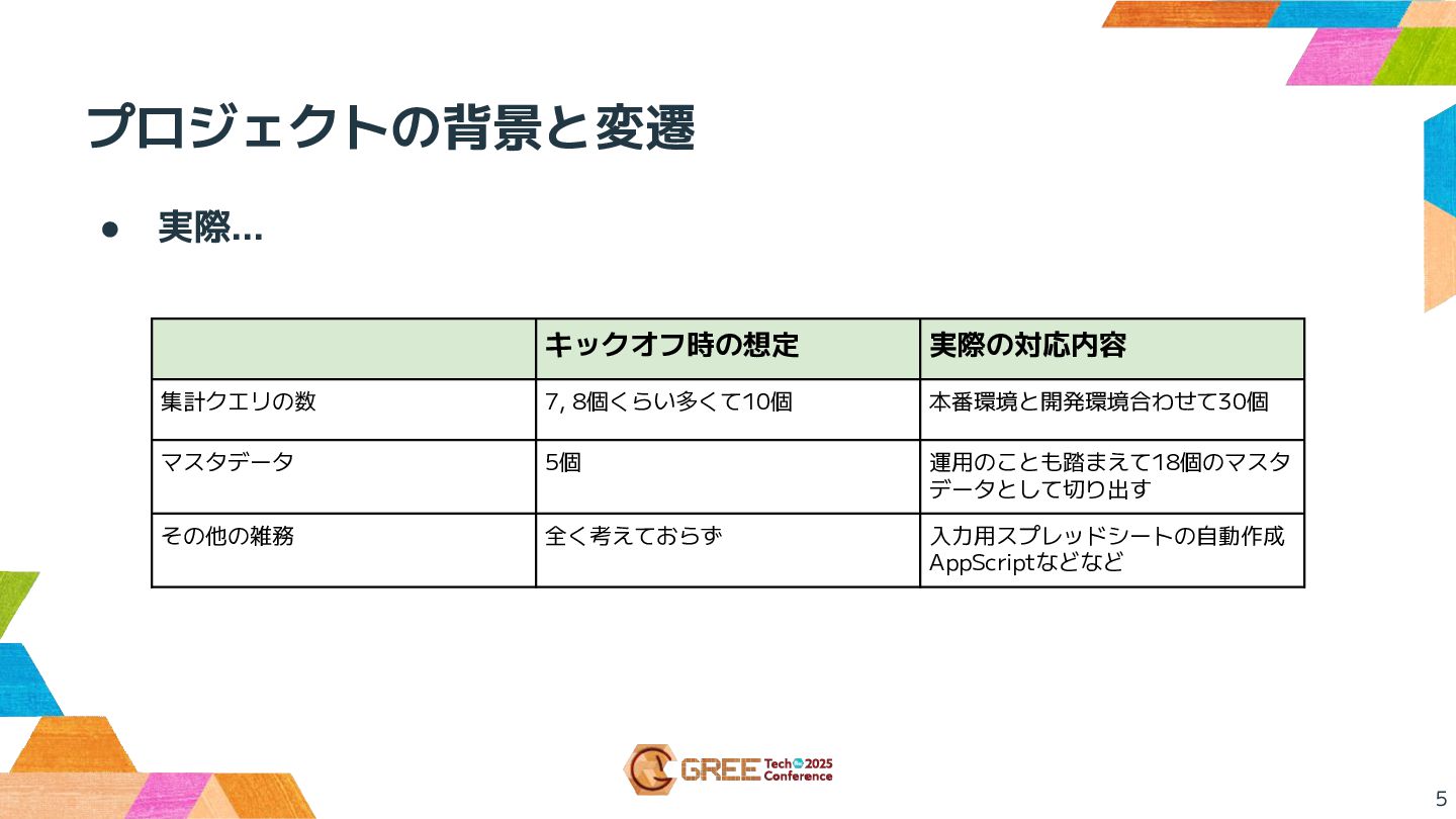 サーバー費の日次の集計と可視化 • 部署のPL収支の可視化 • etc… • 2023年秋開始 ◦ 大きく分けて3つのレポートを作成するという内容 ◦ キックオフの第一印象は集計クエリを数個作ればいいのかなくらいの印象だった 4