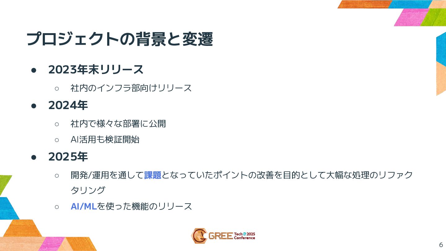 プロジェクトの背景と変遷 • 2023年末リリース ◦ 社内のインフラ部向けリリース • 2024年 ◦ 社内で様々な部署に公開 ◦