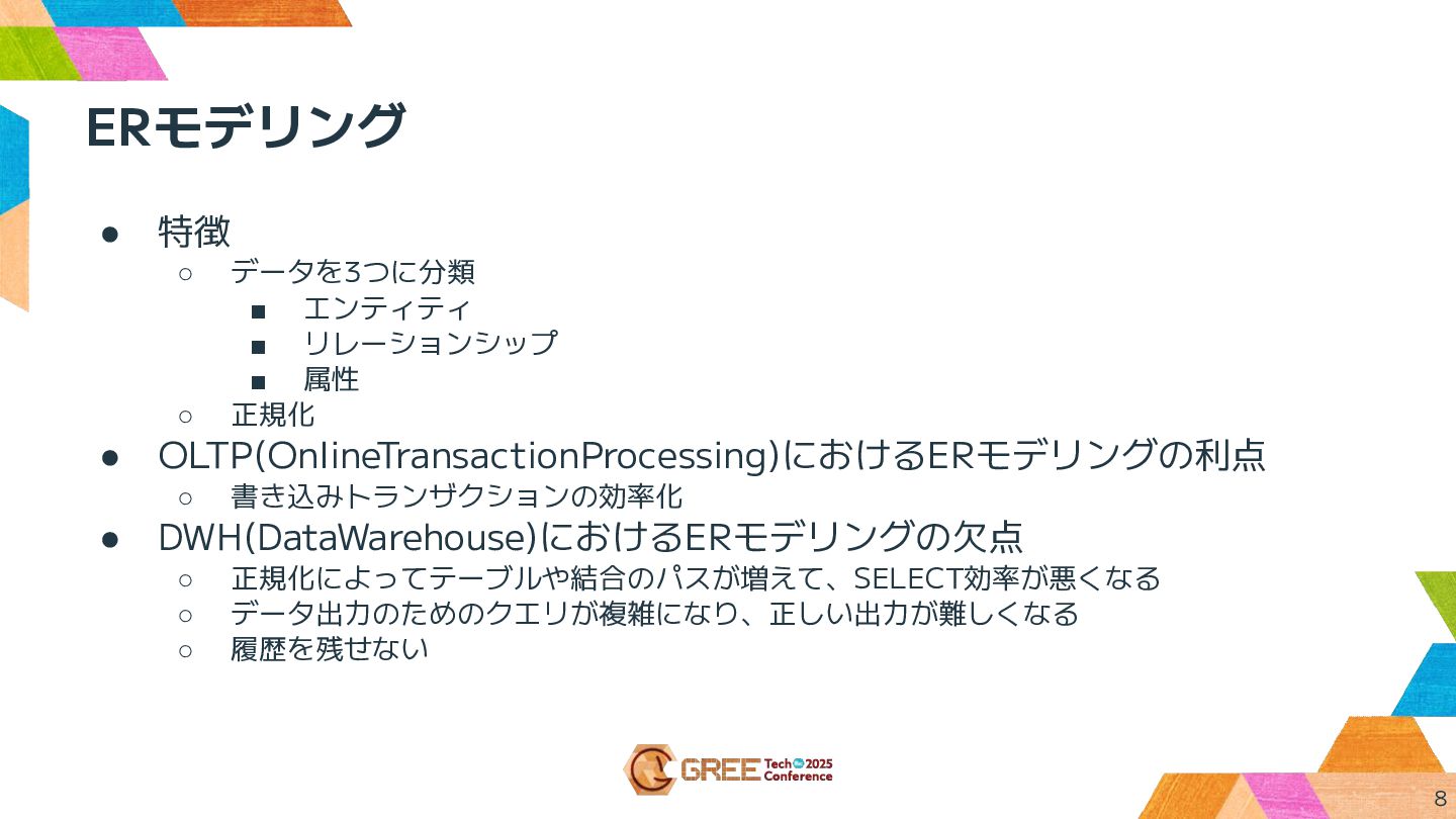 属性 ◦ 正規化 • OLTP(OnlineTransactionProcessing)におけるERモデリングの利点 ◦ 書き込みトランザクションの効率化 • DWH(DataWarehouse)におけるERモデリングの欠点 ◦ 正規化によってテーブルや結合のパスが増えて、SELECT効率が悪くなる ◦ データ出力のためのクエリが複雑になり、正しい出力が難しくなる ◦ 履歴を残せない 8