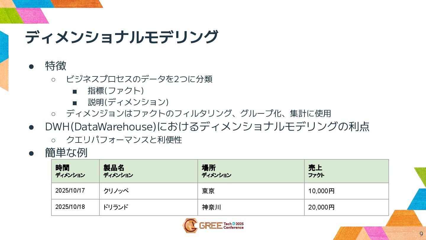 ディメンジョンはファクトのフィルタリング、グループ化、集計に使用 • DWH(DataWarehouse)におけるディメンショナルモデリングの利点 ◦ クエリパフォーマンスと利便性 • 簡単な例 9 時間 ディメンション 製品名 ディメンション 場所 ディメンション 売上 ファクト 2025/10/17 クリノッペ 東京 10,000円 2025/10/18 ドリランド 神奈川 20,000円