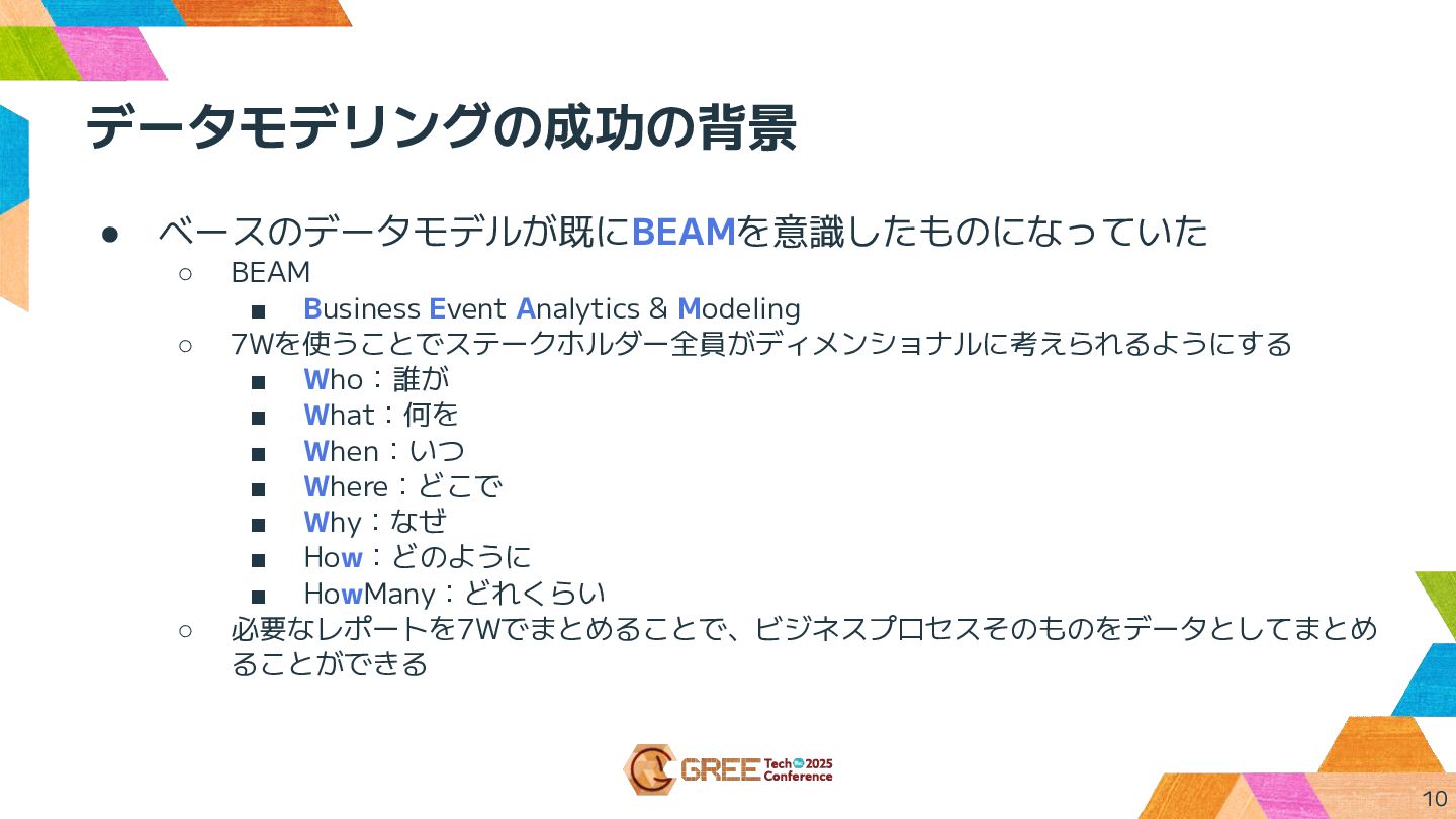 データモデリングの成功の背景 • ベースのデータモデルが既にBEAMを意識したものになっていた ◦ BEAM ▪ Business Event Analytics &