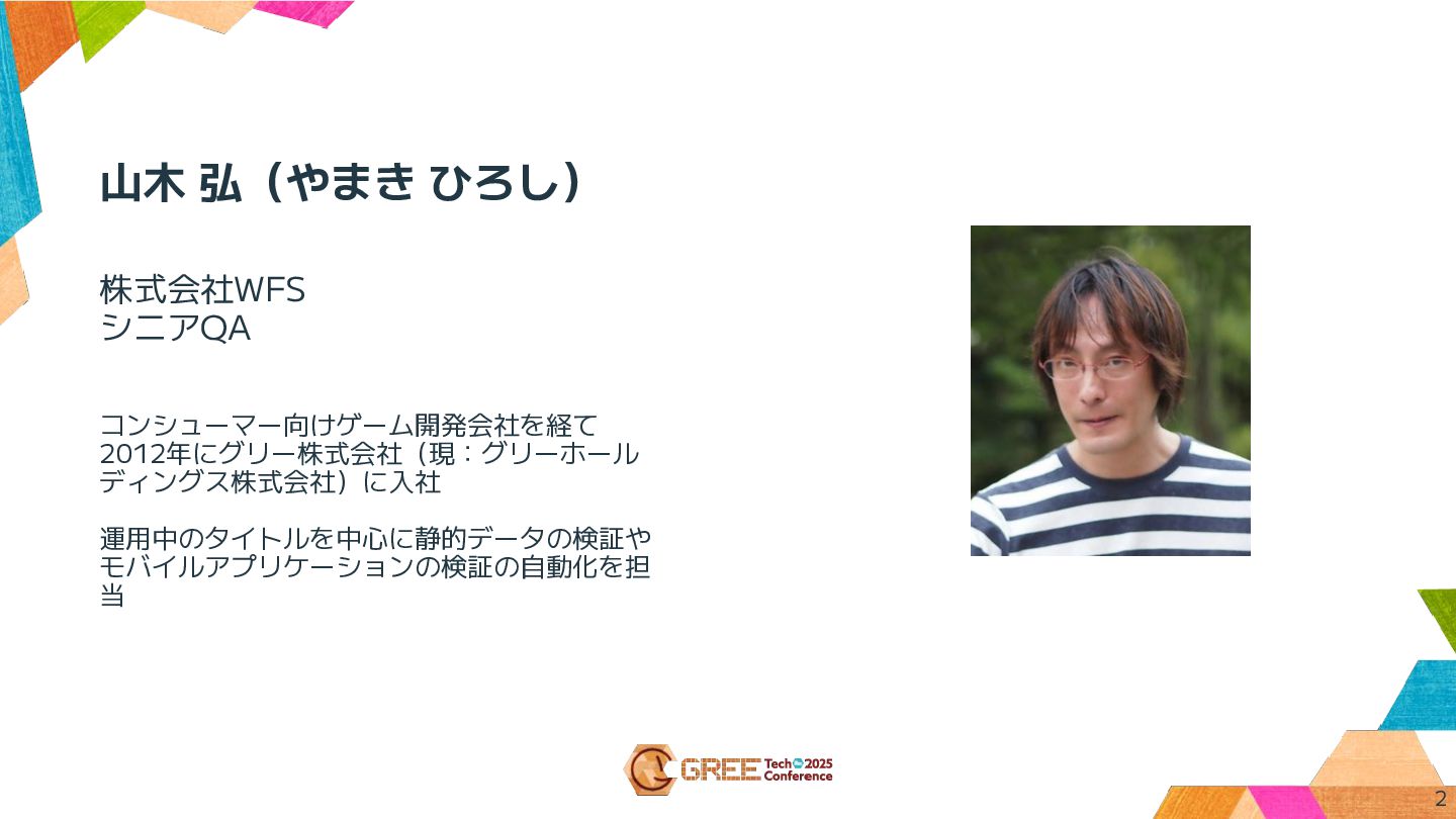 2 山木 弘(やまき ひろし) 株式会社WFS シニアQA コンシューマー向けゲーム開発会社を経て 2012年にグリー株式会社(現:グリーホール ディングス株式会社)に入社 運用中のタイトルを中心に静的データの検証や