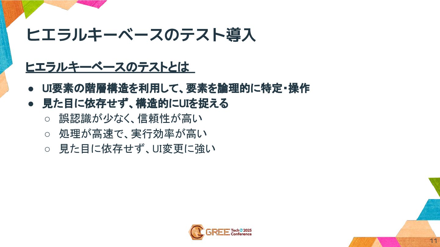 変更による失敗(堅牢性) 10 ヒエラルキーベースのテスト導入 UI構造の情報を利用するヒエラルキーベースのテストを導入
