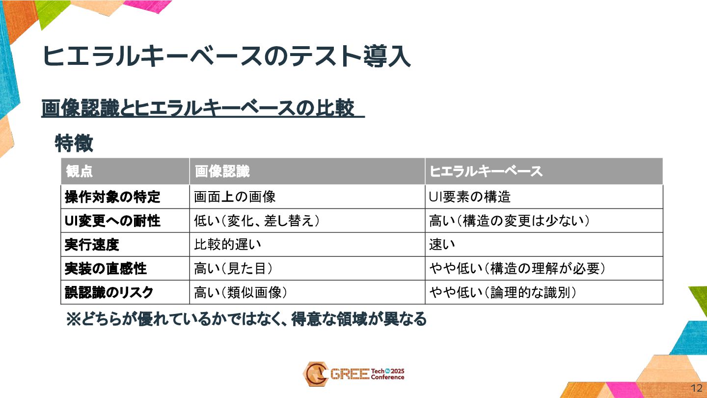 画像認識とヒエラルキーベースの比較 特徴 12 ヒエラルキーベースのテスト導入 観点 画像認識 ヒエラルキーベース 操作対象の特定 画面上の画像