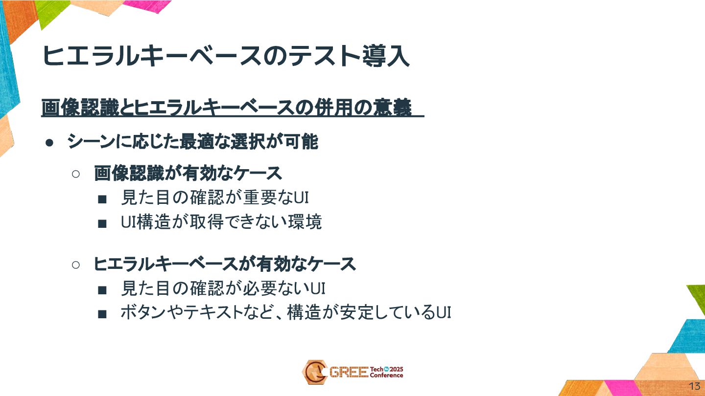 ▪ 見た目の確認が重要なUI ▪ UI構造が取得できない環境 ◦ ヒエラルキーベースが有効なケース ▪ 見た目の確認が必要ないUI ▪ ボタンやテキストなど、構造が安定しているUI