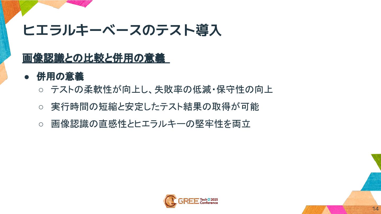 13 ヒエラルキーベースのテスト導入 画像認識とヒエラルキーベースの併用の意義 • シーンに応じた最適な選択が可能 ◦ 画像認識が有効なケース