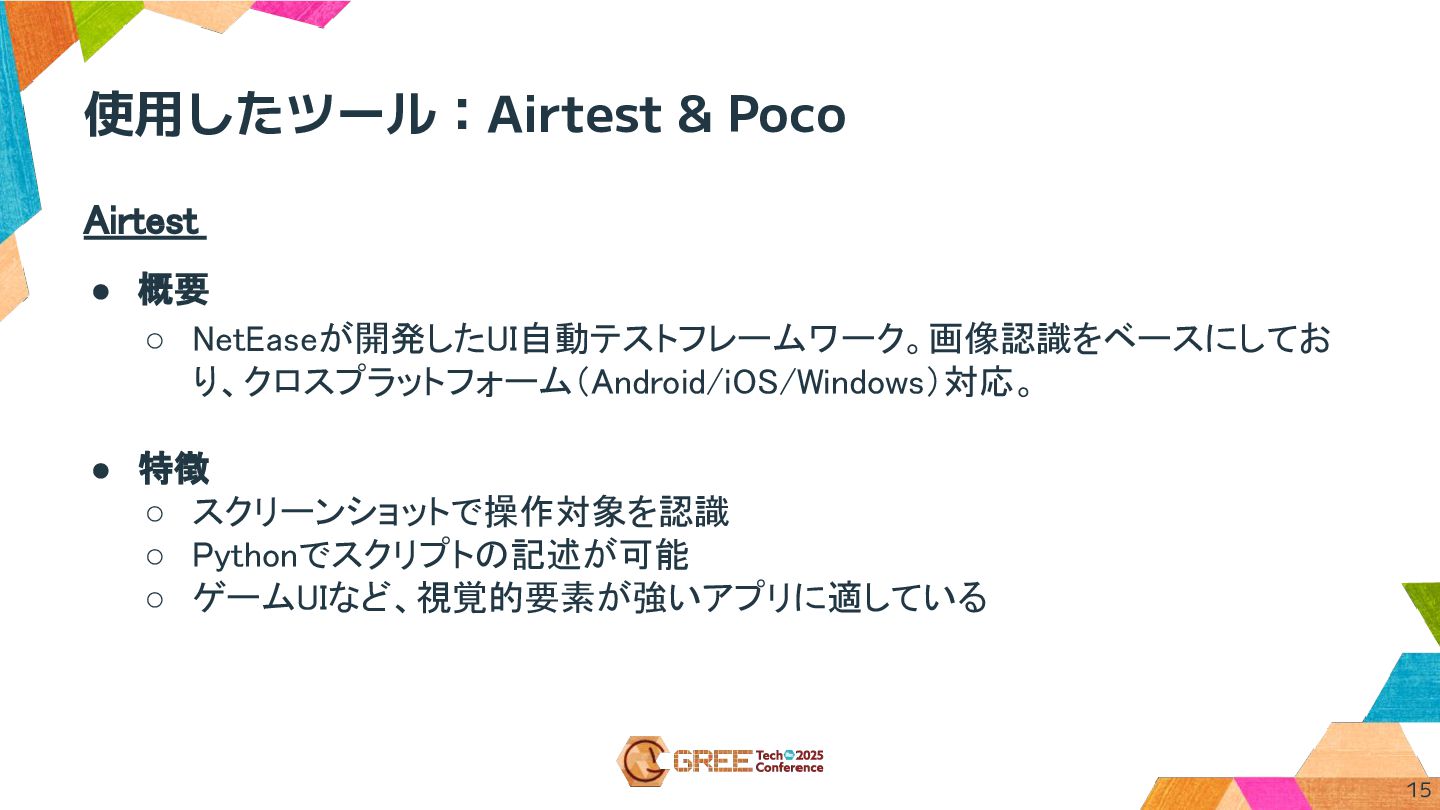 り、クロスプラットフォーム(Android/iOS/Windows)対応。 • 特徴 ◦ スクリーンショットで操作対象を認識 ◦ Pythonでスクリプトの記述が可能 ◦ ゲームUIなど、視覚的要素が強いアプリに適している