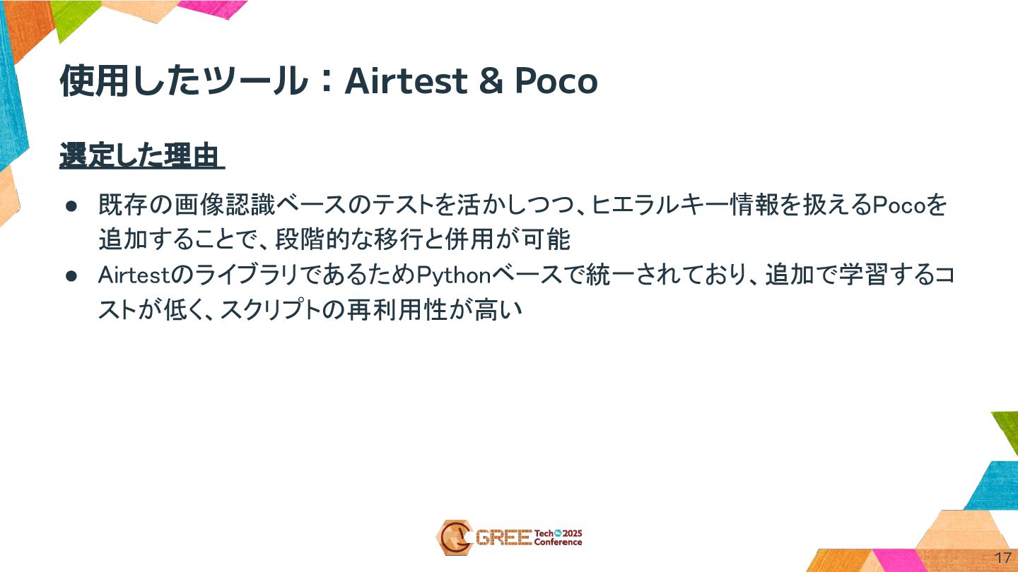 16 使用したツール:Airtest & Poco Poco • 概要 ◦ Airtestと連携して動作するUI要素取得ライブラリ。アプリのUIツリー構造を取 得し、ヒエラルキー情報に基づいて要素を操作