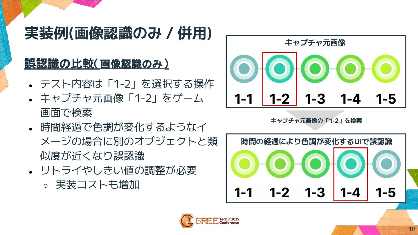 キャプチャ元画像「1-2」をゲーム 画面で検索 • 時間経過で色調が変化するようなイ メージの場合に別のオブジェクトと類 似度が近くなり誤認識 • リトライやしきい値の調整が必要 ◦ 実装コストも増加 キャプチャ元画像 時間の経過により色調が変化するUIで誤認識 キャプチャ元画像の「1-2」を検索