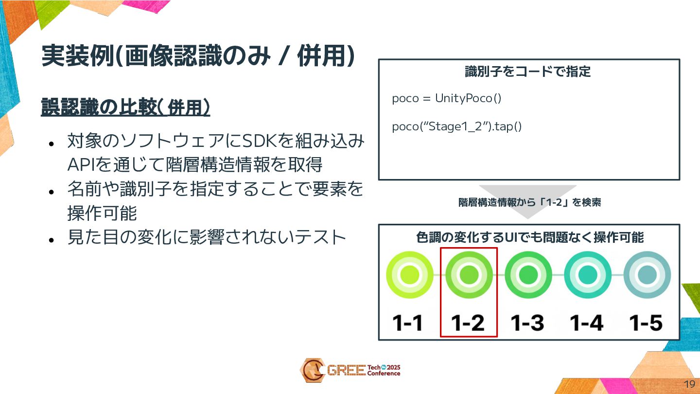 名前や識別子を指定することで要素を 操作可能 • 見た目の変化に影響されないテスト 識別子をコードで指定 poco = UnityPoco() poco(“Stage1_2”).tap() 階層構造情報から「1-2」を検索 色調の変化するUIでも問題なく操作可能