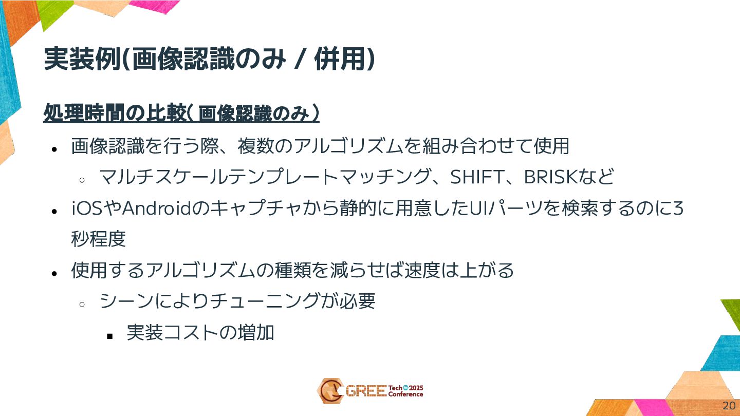 マルチスケールテンプレートマッチング、SHIFT、BRISKなど • iOSやAndroidのキャプチャから静的に用意したUIパーツを検索するのに3 秒程度 • 使用するアルゴリズムの種類を減らせば速度は上がる ◦ シーンによりチューニングが必要 ▪ 実装コストの増加