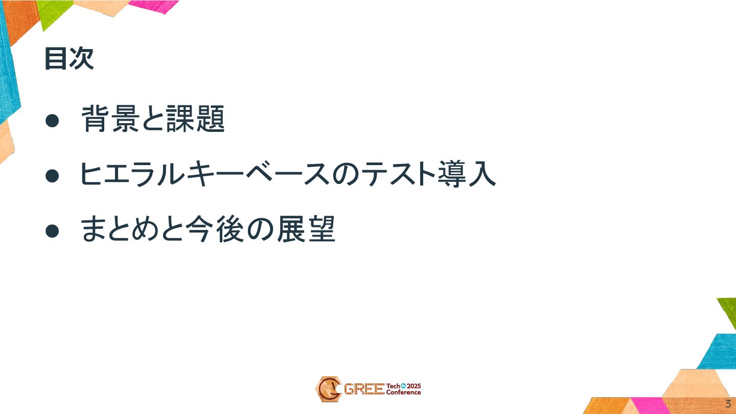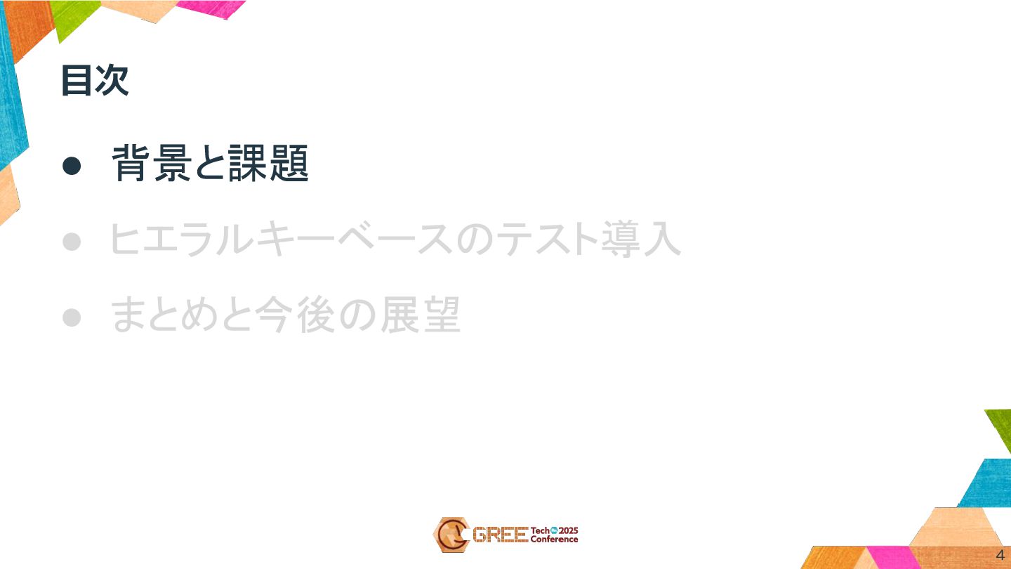 3 目次 • 背景と課題 • ヒエラルキーベースのテスト導入 • まとめと今後の展望