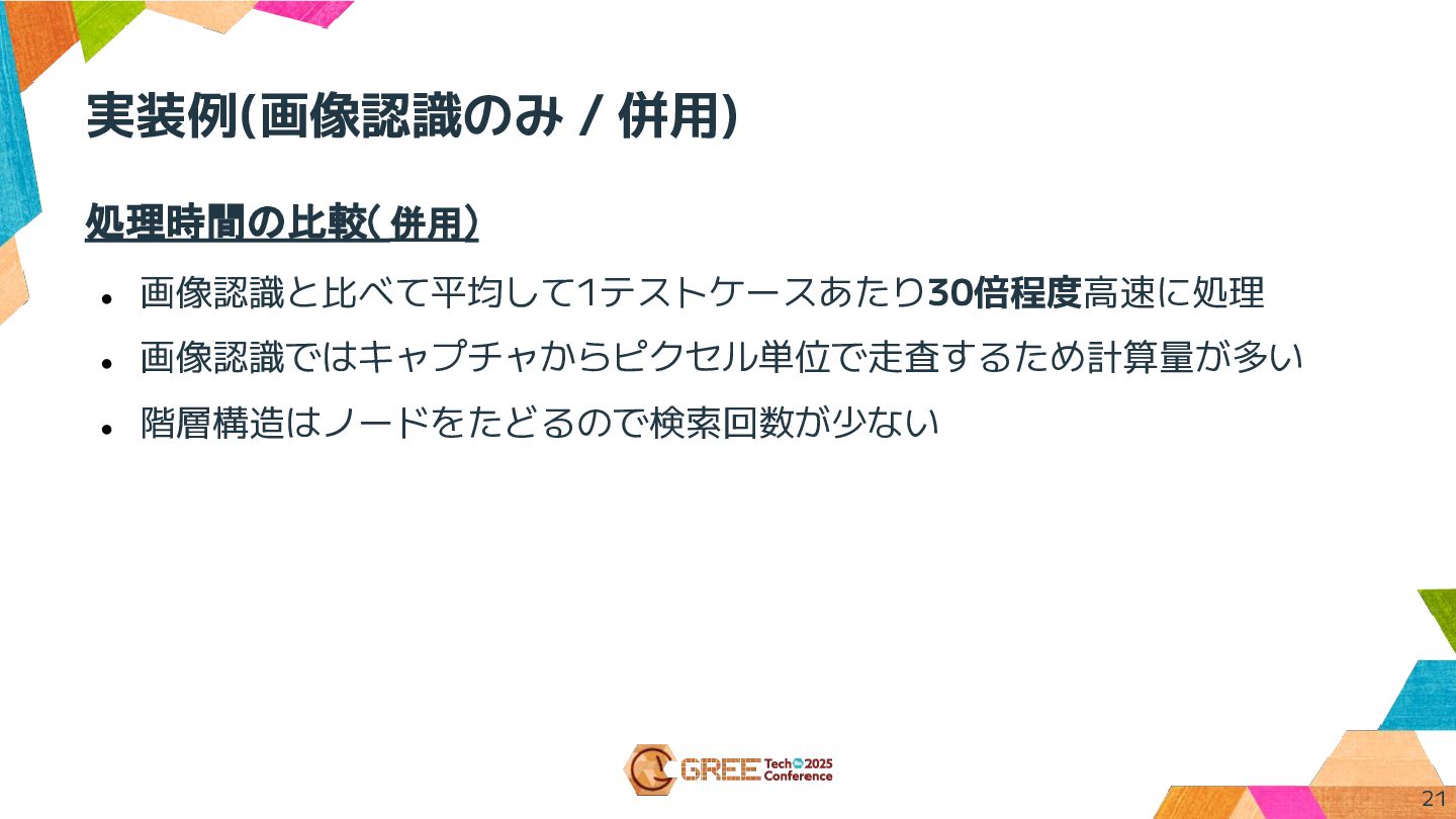 21 実装例(画像認識のみ / 併用) 処理時間の比較( 併用) • 画像認識と比べて平均して1テストケースあたり30倍程度高速に処理 • 画像認識ではキャプチャからピクセル単位で走査するため計算量が多い