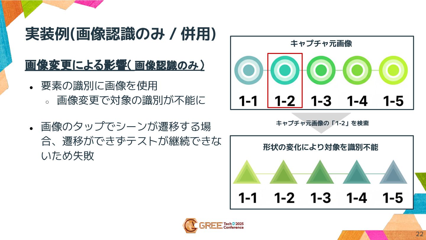 画像変更で対象の識別が不能に • 画像のタップでシーンが遷移する場 合、遷移ができずテストが継続できな いため失敗 キャプチャ元画像 形状の変化により対象を識別不能 キャプチャ元画像の「1-2」を検索