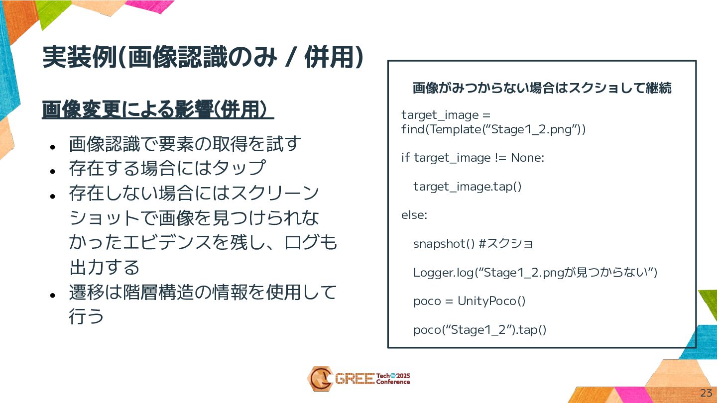 • 存在しない場合にはスクリーン ショットで画像を見つけられな かったエビデンスを残し、ログも 出力する • 遷移は階層構造の情報を使用して 行う 画像がみつからない場合はスクショして継続 target_image = find(Template(“Stage1_2.png”)) if target_image != None: target_image.tap() else: snapshot() #スクショ Logger.log(“Stage1_2.pngが見つからない”) poco = UnityPoco() poco(“Stage1_2”).tap()