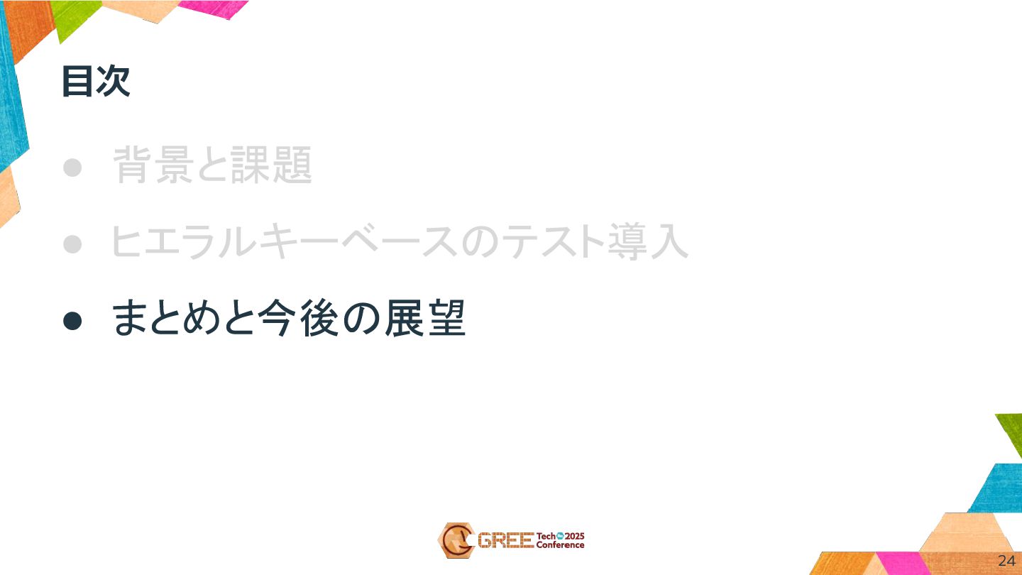 24 目次 • 背景と課題 • ヒエラルキーベースのテスト導入 • まとめと今後の展望
