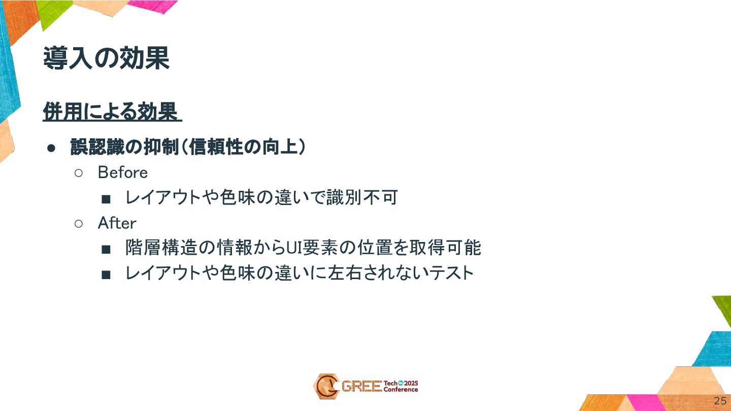 実行時間の短縮と安定したテスト結果の取得が可能 ◦ 画像認識の直感性とヒエラルキーの堅牢性を両立