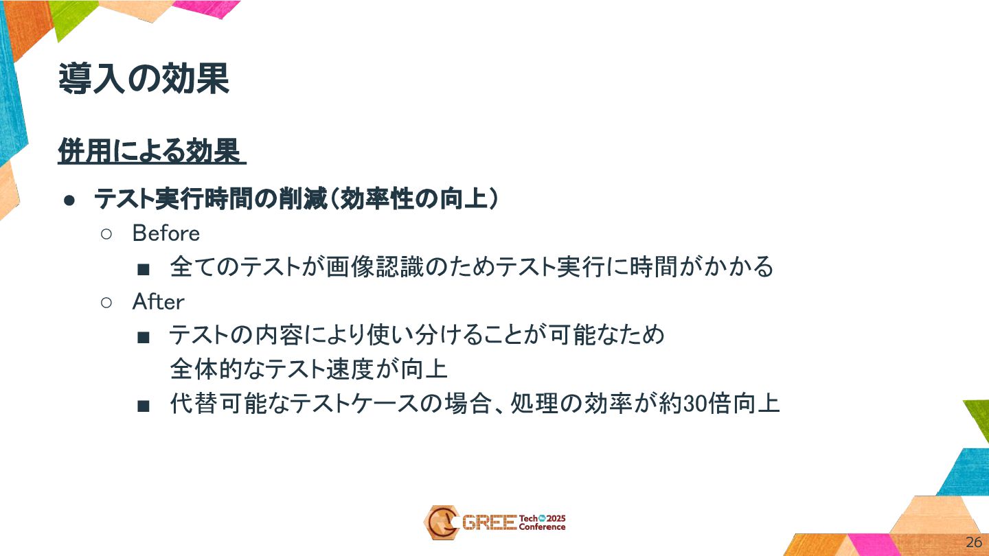 全てのテストが画像認識のためテスト実行に時間がかかる ◦ After ▪ テストの内容により使い分けることが可能なため 全体的なテスト速度が向上 ▪ 代替可能なテストケースの場合、処理の効率が約30倍向上