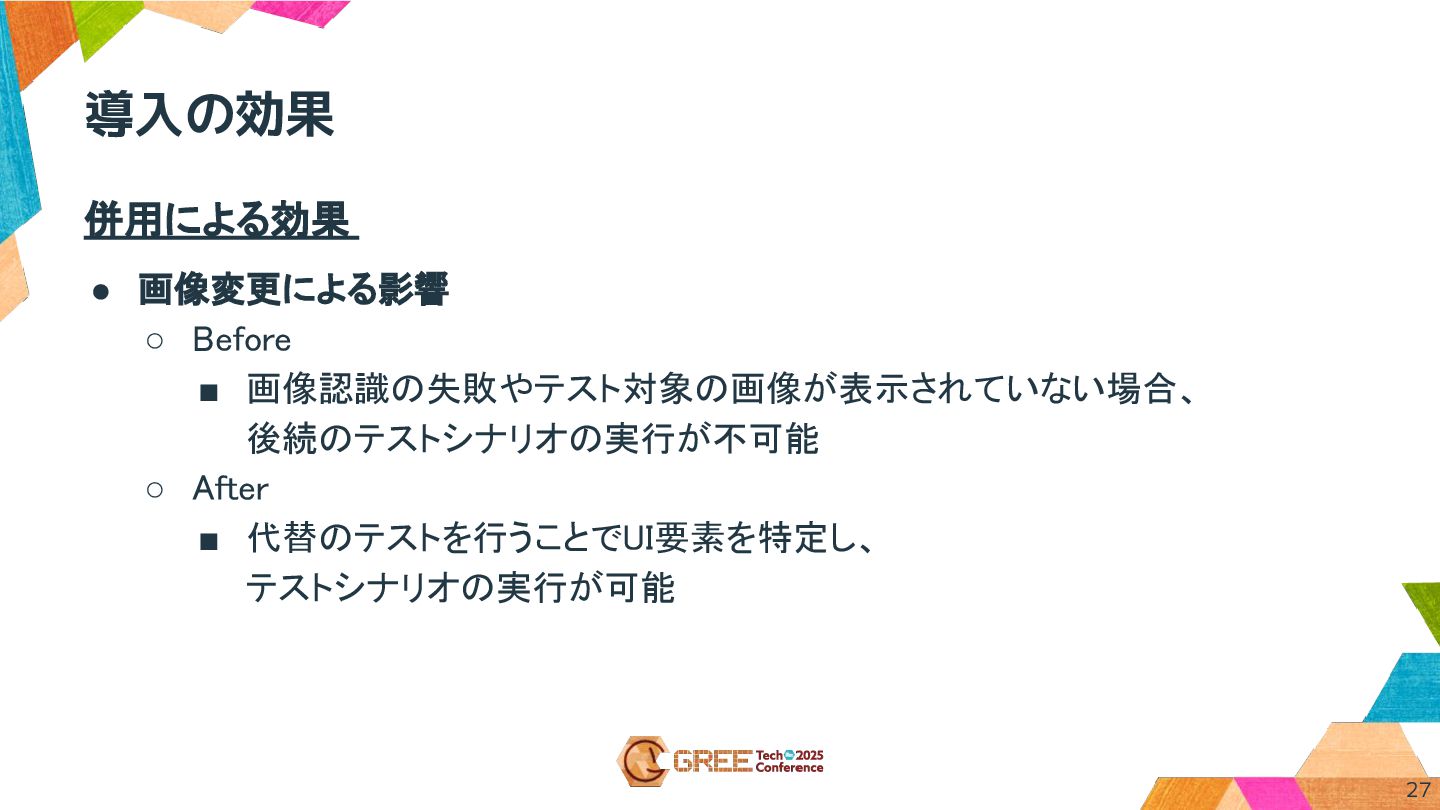 画像認識の失敗やテスト対象の画像が表示されていない場合、 後続のテストシナリオの実行が不可能 ◦ After ▪ 代替のテストを行うことでUI要素を特定し、 テストシナリオの実行が可能