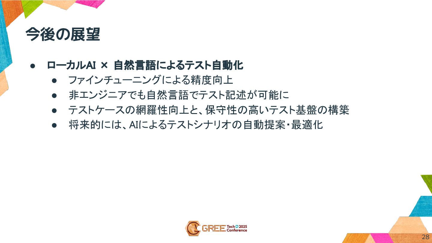 28 今後の展望 • ローカルAI × 自然言語によるテスト自動化 • ファインチューニングによる精度向上 •
