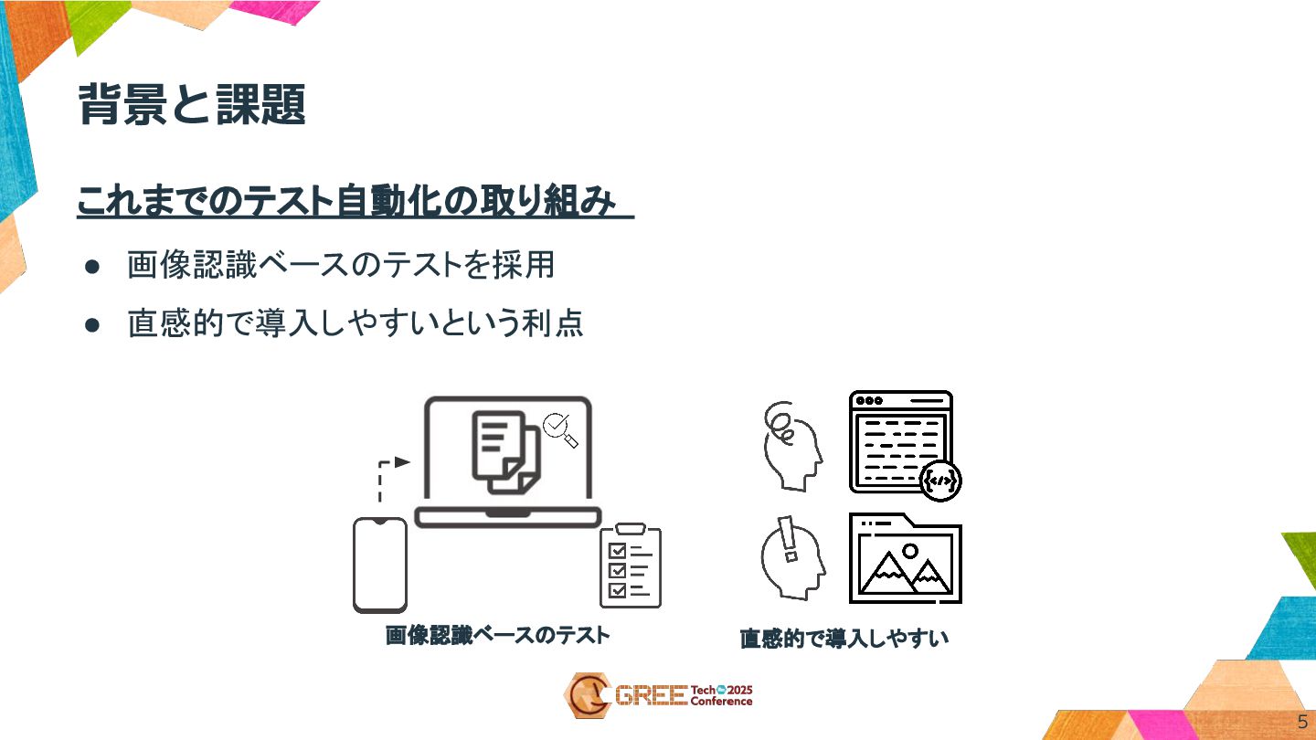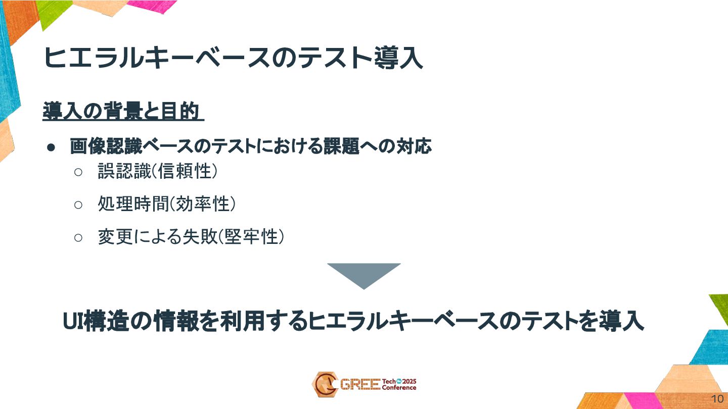 導入の背景と目的 • 画像認識ベースのテストにおける課題への対応 ◦ 誤認識(信頼性) ◦ 処理時間(効率性) ◦