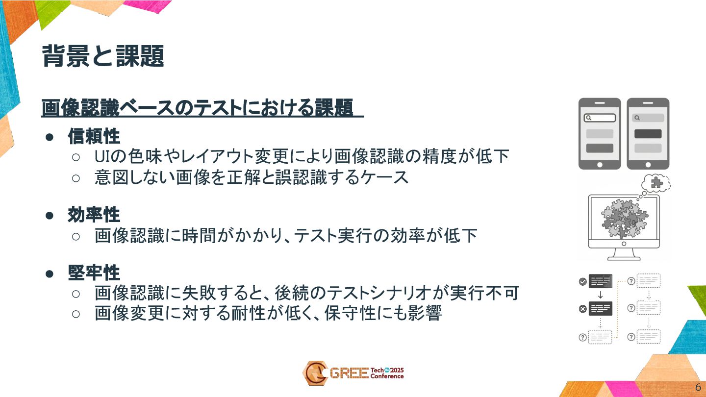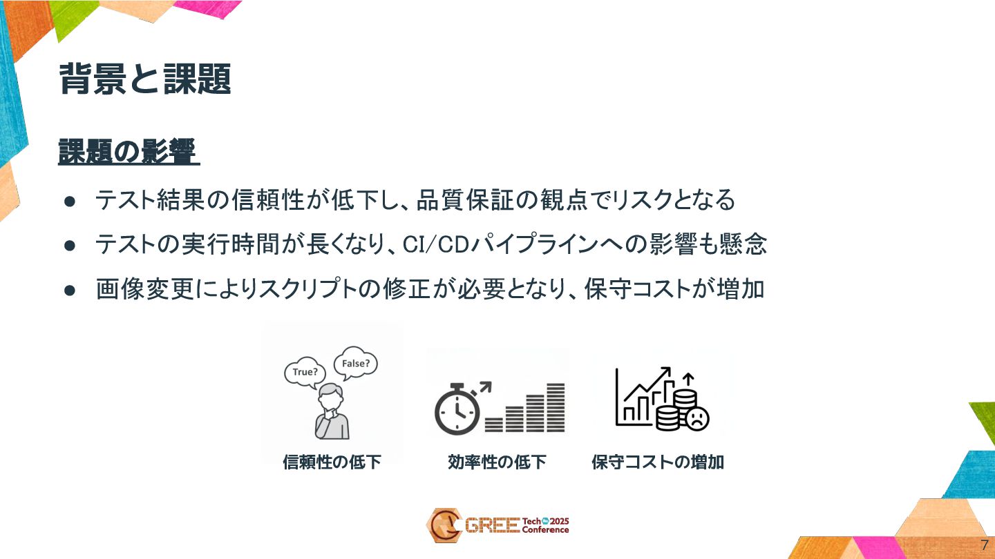 ◦ 画像認識に時間がかかり、テスト実行の効率が低下 • 堅牢性 ◦ 画像認識に失敗すると、後続のテストシナリオが実行不可 ◦ 画像変更に対する耐性が低く、保守性にも影響 6 背景と課題