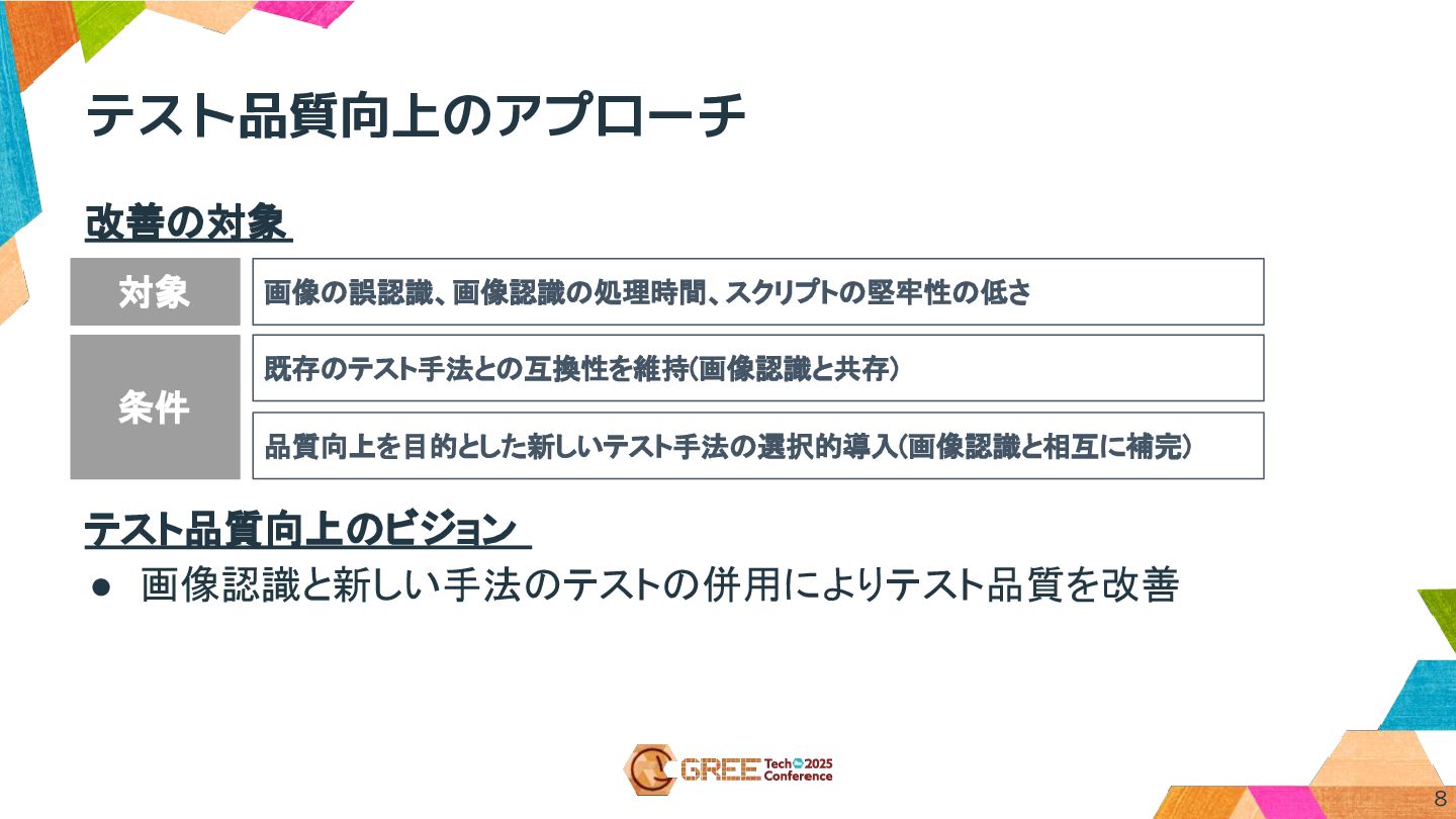 7 背景と課題 課題の影響 • テスト結果の信頼性が低下し、品質保証の観点でリスクとなる • テストの実行時間が長くなり、CI/CDパイプラインへの影響も懸念 • 画像変更によりスクリプトの修正が必要となり、保守コストが増加