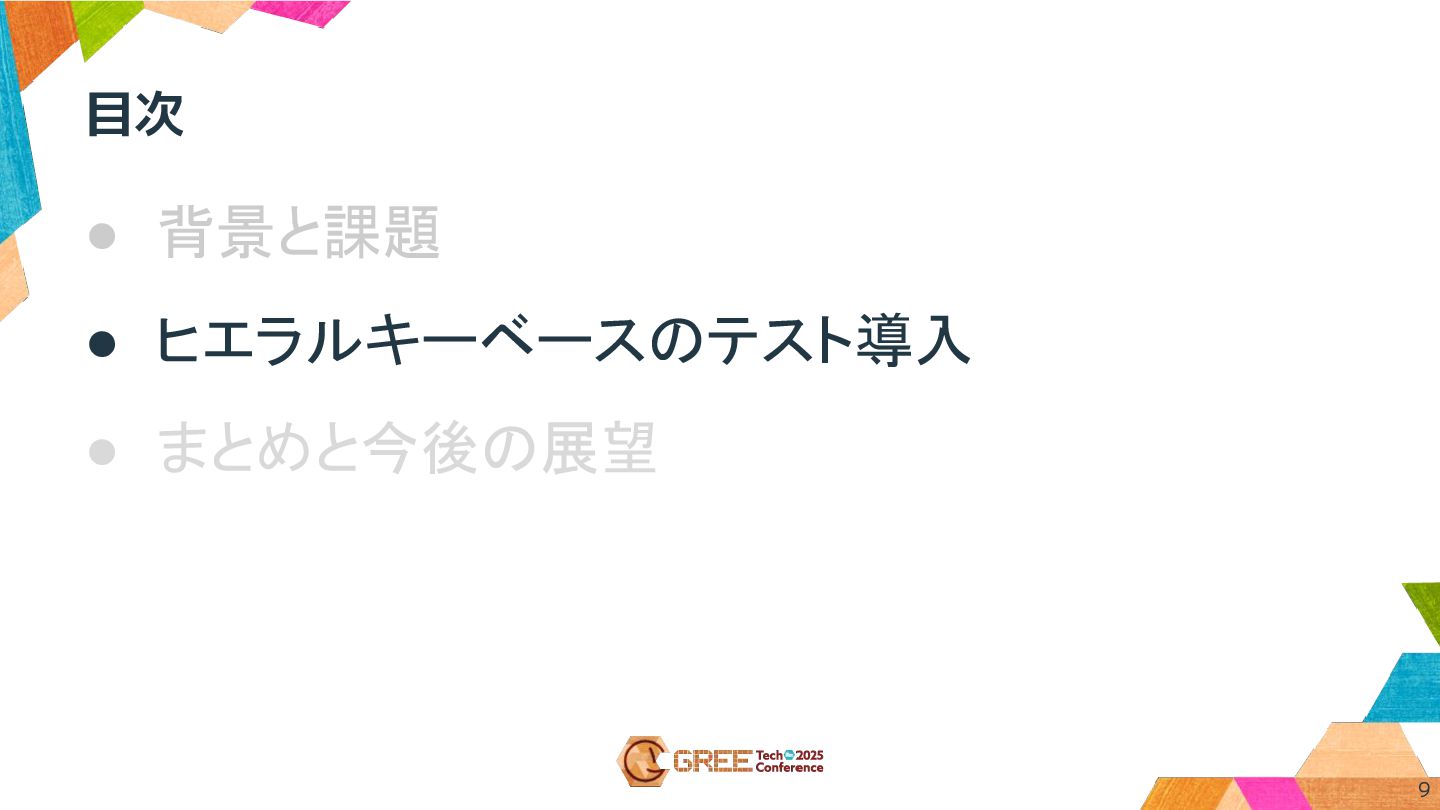 9 目次 • 背景と課題 • ヒエラルキーベースのテスト導入 • まとめと今後の展望