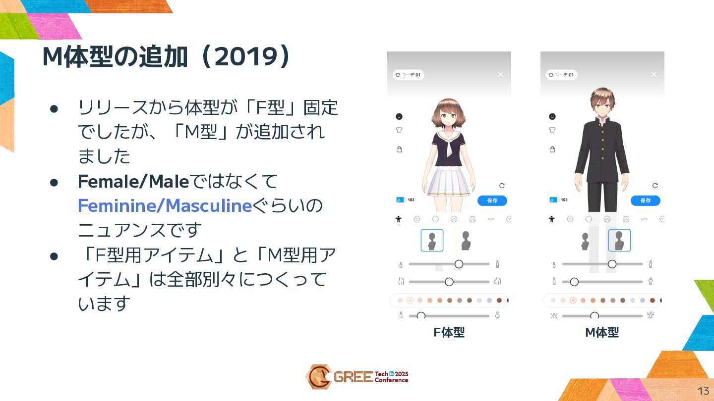 4. M体型の追加(2019) • 「F型の素体」と「M型の素体」が別に存在します ◦ F型でつくったメッシュをM型に「コンバート」したり、テクスチャやアクセサリをFMで 共通で使いまわすこともあるのですが、基本的には制作コストが2倍です • 3D技術的には素体を別にするメリットはそこそこあります ◦ 衣装パーツの体型変化時の互換性がよくなります
