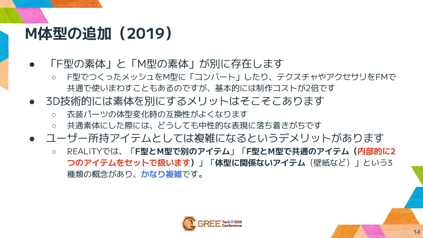 ◦ 共通素体にした際には、どうしても中性的な表現に落ち着きがちです • ユーザー所持アイテムとしては複雑になるというデメリットがあります ◦ REALITYでは、「F型とM型で別のアイテム」「F型とM型で共通のアイテム(内部的に2 つのアイテムをセットで扱います)」「体型に関係ないアイテム(壁紙など)」という3 種類の概念があり、かなり複雑です。 14