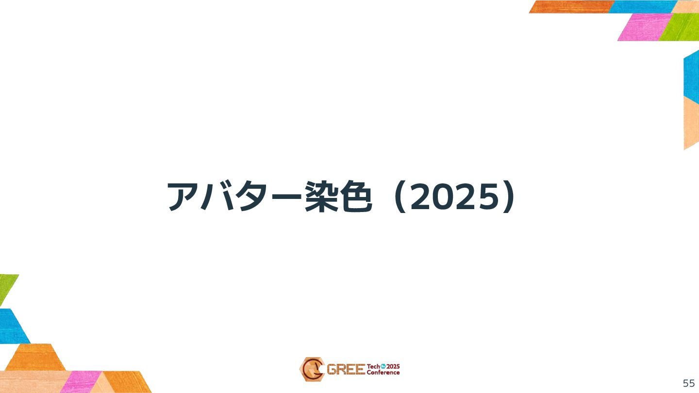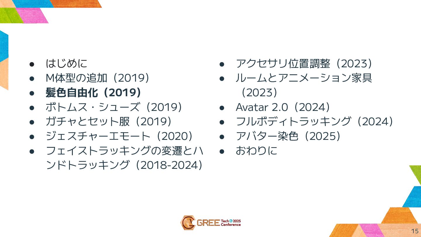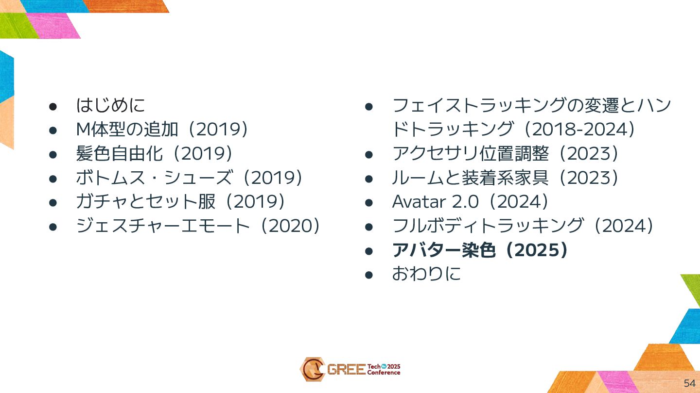• ジェスチャーエモート(2020) 54 • フェイストラッキングの変遷とハン ドトラッキング(2018-2024) • アクセサリ位置調整(2023) • ルームと装着系家具(2023) • Avatar 2.0(2024) • フルボディトラッキング(2024) • アバター染色(2025) • おわりに
