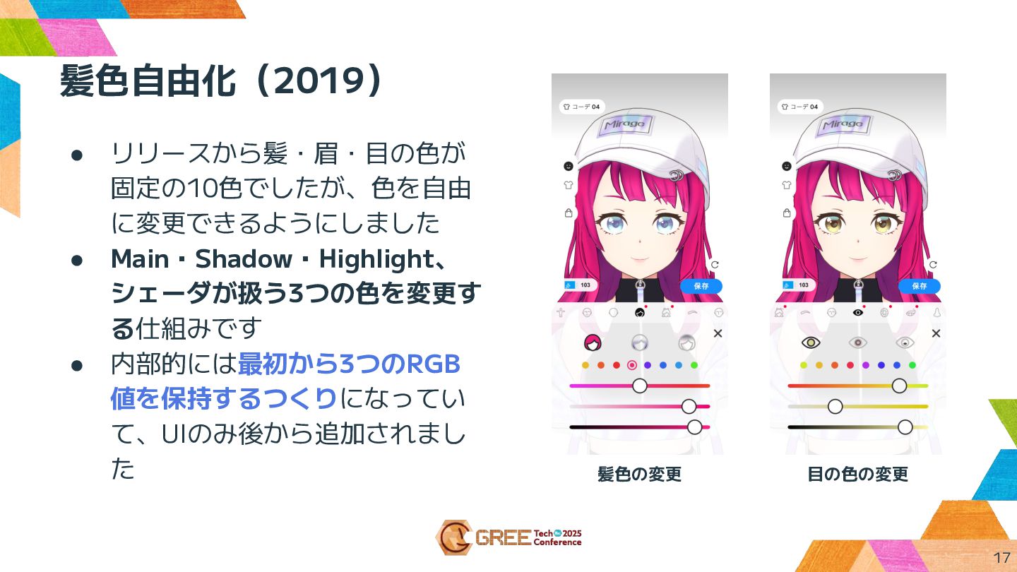 16. • はじめに • M体型の追加(2019) • 髪色自由化(2019) • ボトムス・シューズ(2019) • ガチャとセット服(2019)
