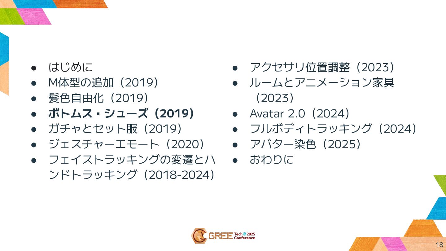• ジェスチャーエモート(2020) • フェイストラッキングの変遷とハ ンドトラッキング(2018-2024) 18 • アクセサリ位置調整(2023) • ルームとアニメーション家具 (2023) • Avatar 2.0(2024) • フルボディトラッキング(2024) • アバター染色(2025) • おわりに