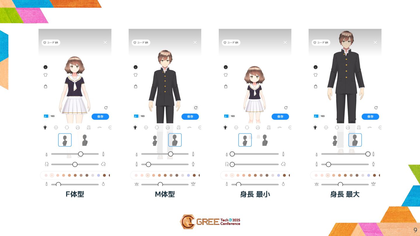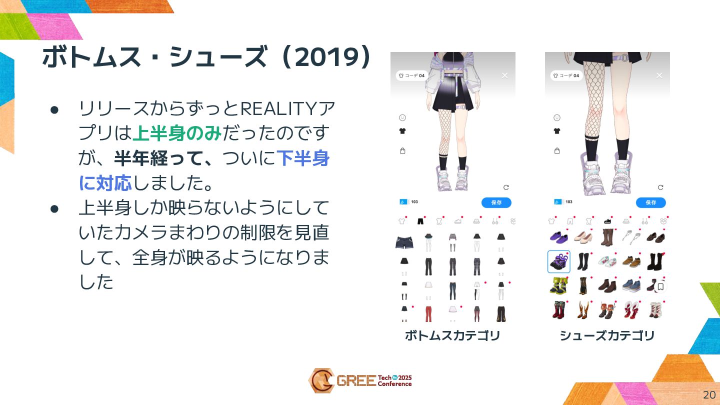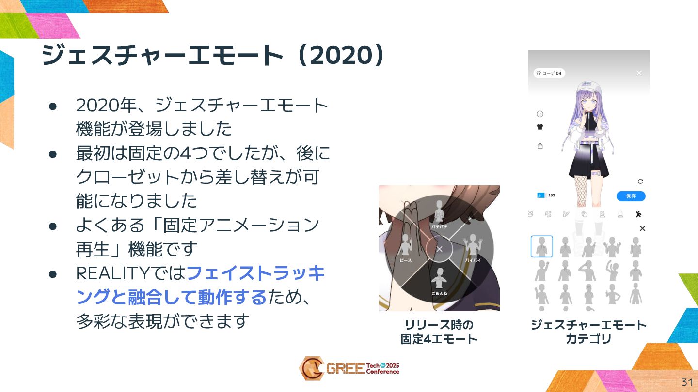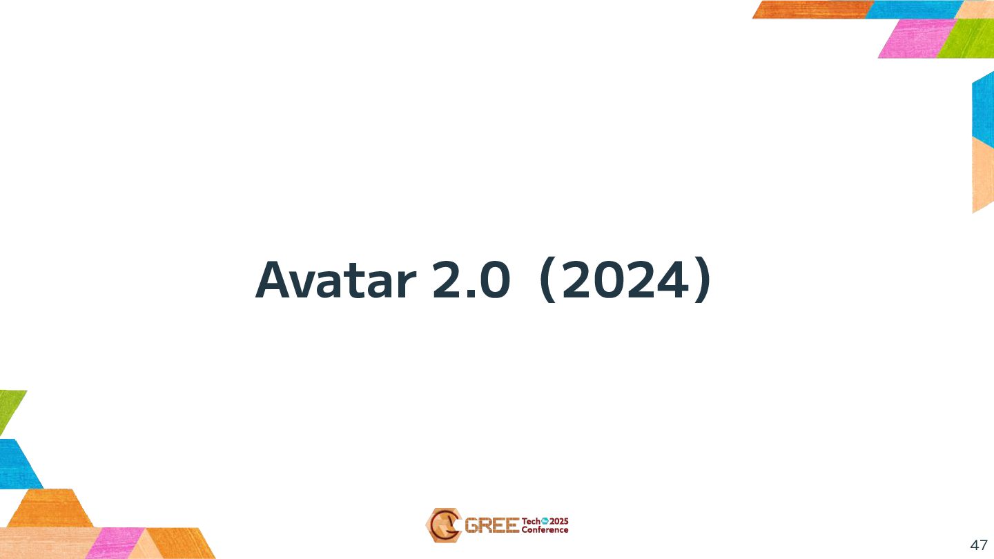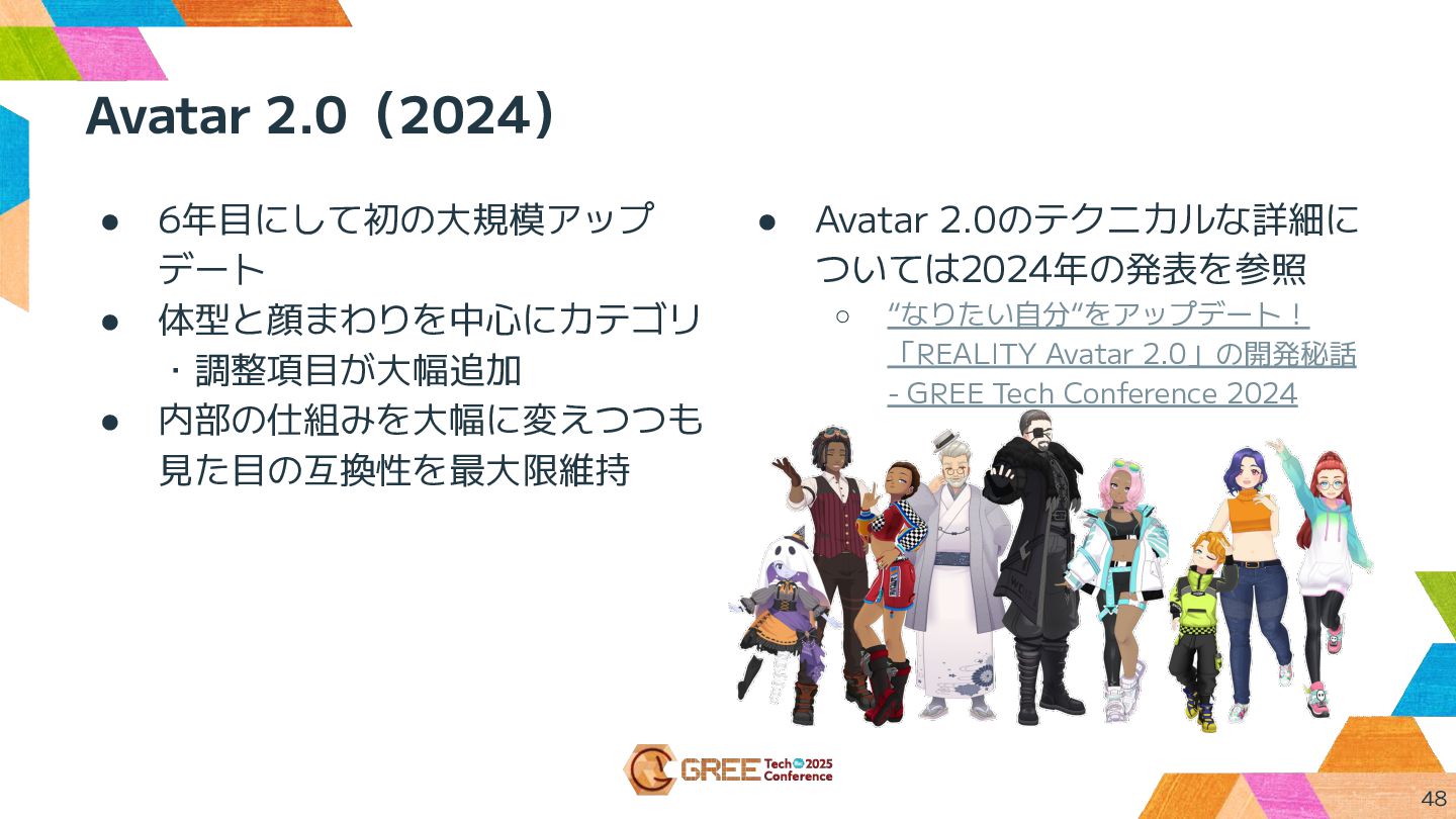 内部の仕組みを大幅に変えつつも 見た目の互換性を最大限維持 • Avatar 2.0のテクニカルな詳細に ついては2024年の発表を参照 ◦ “なりたい自分“をアップデート! 「REALITY Avatar 2.0」の開発秘話 - GREE Tech Conference 2024
