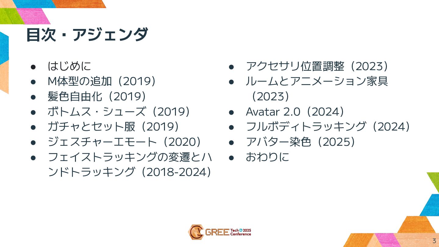 • ジェスチャーエモート(2020) • フェイストラッキングの変遷とハ ンドトラッキング(2018-2024) 3 • アクセサリ位置調整(2023) • ルームとアニメーション家具 (2023) • Avatar 2.0(2024) • フルボディトラッキング(2024) • アバター染色(2025) • おわりに 目次・アジェンダ