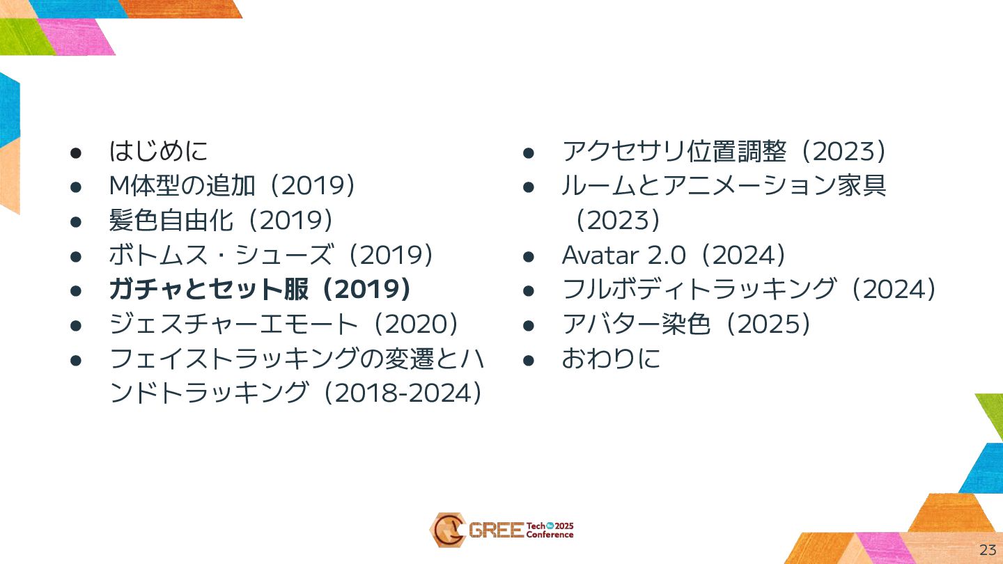 • ジェスチャーエモート(2020) • フェイストラッキングの変遷とハ ンドトラッキング(2018-2024) 23 • アクセサリ位置調整(2023) • ルームとアニメーション家具 (2023) • Avatar 2.0(2024) • フルボディトラッキング(2024) • アバター染色(2025) • おわりに