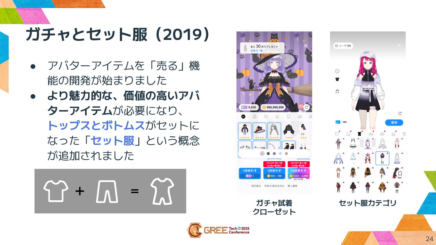 24. • はじめに • M体型の追加(2019) • 髪色自由化(2019) • ボトムス・シューズ(2019) • ガチャとセット服(2019)