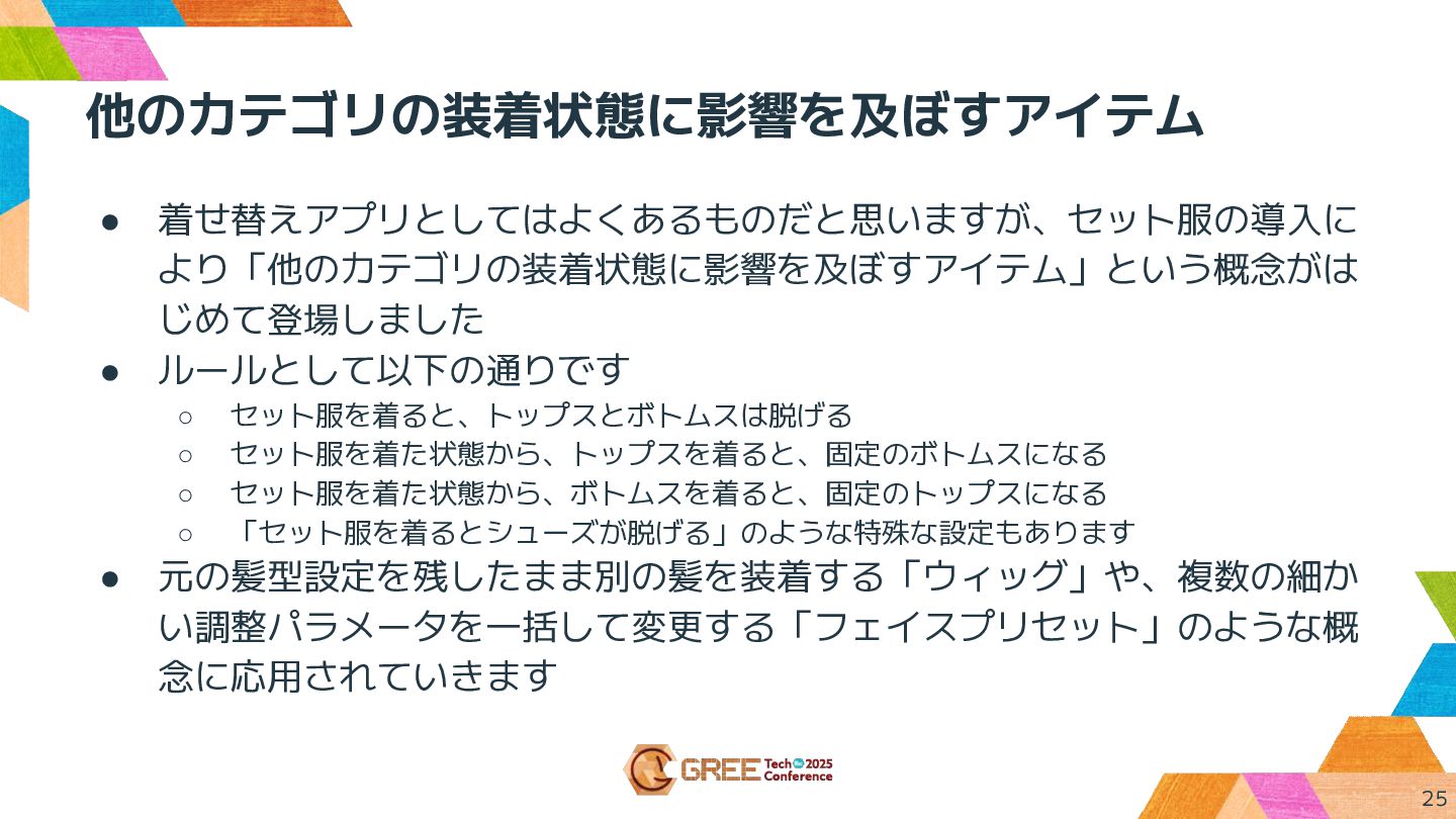 セット服を着た状態から、トップスを着ると、固定のボトムスになる ◦ セット服を着た状態から、ボトムスを着ると、固定のトップスになる ◦ 「セット服を着るとシューズが脱げる」のような特殊な設定もあります • 元の髪型設定を残したまま別の髪を装着する「ウィッグ」や、複数の細か い調整パラメータを一括して変更する「フェイスプリセット」のような概 念に応用されていきます 25